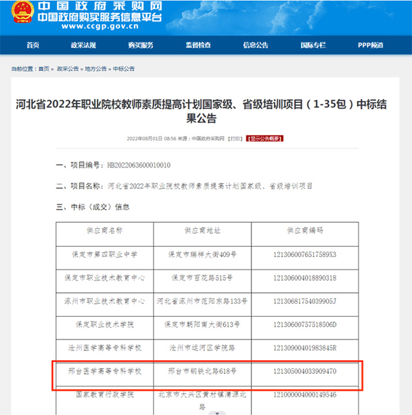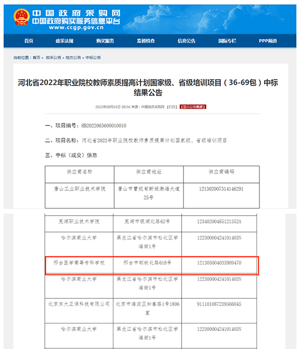 近日,中国政府采购网公布了河北省2022年职业院校教师素质提高计划国家级、省级培训项目中标结果,Beat365申报的大学生心理健康指导教师培训、职业学校学生心理疏导与心理危机干预专题培训、技能大赛指导教师课赛融合与技能训练培训(医药卫生大类)、产业导师特聘和教师企业实践5个项目成功获批,计划培训245人,累计项目资金99.8万元,项目数和项目资金均创历史新高。