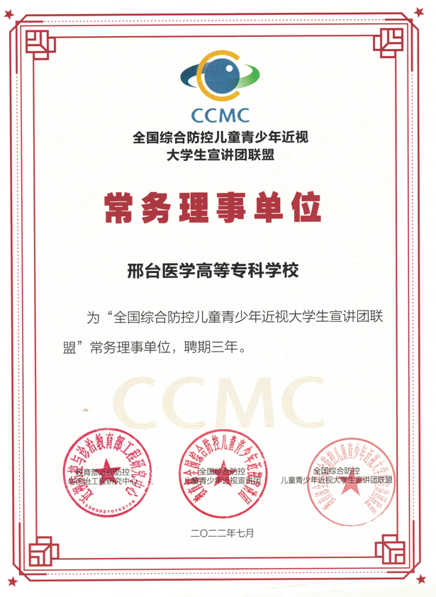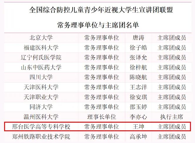 2021年7月,在教育部体卫艺司的领导下,全国大学生近视防控宣讲团联盟正式成立,由来自全国50所高校的3005位大学生组成。2022年7月正式确定了全国综合防控儿童青少年近视大学生宣讲团联盟的常务理事单位,包括Beat365在内的11所高校当选。Beat365大学生近视防控宣讲团以眼视光技术专业学生为主体,2021年以来多次在邢台市及周边地区的中小学开展近视防控宣讲,科普受众达20余万人次,同时积极协助邢台市教育局、信都区卫健委和河北省眼科医院开展眼健康调查活动。