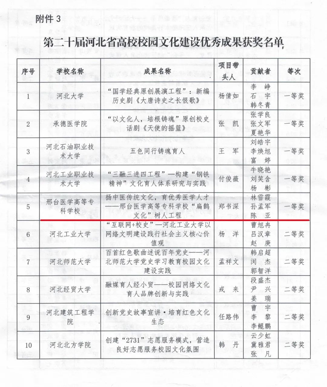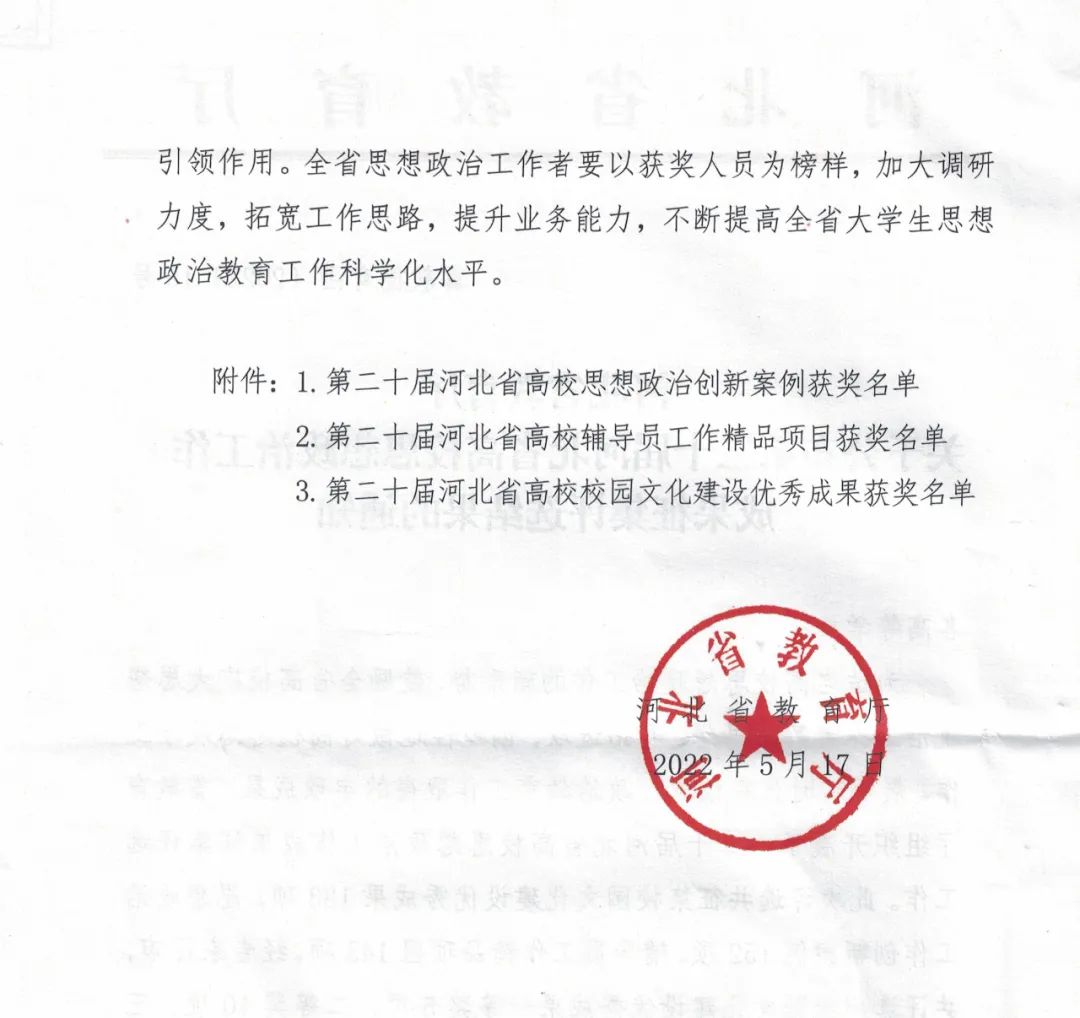 近日,河北省教育厅下发《关于公布第二十届河北省高校思想政治工作成果征集评选结果的通知》(冀教德育函【2022】15号),由学校党委副书记、校长郑书深主持,党委委员、副校长林雪霞、公共教学部主任孙孟军、教务处副处长陈亚参与的《扬中医传统文化,育优秀医学人才——邢台医学高等专科学校“扁鹊文化”树人工程》项目荣获河北省高校校园文化建设优秀成果一等奖。