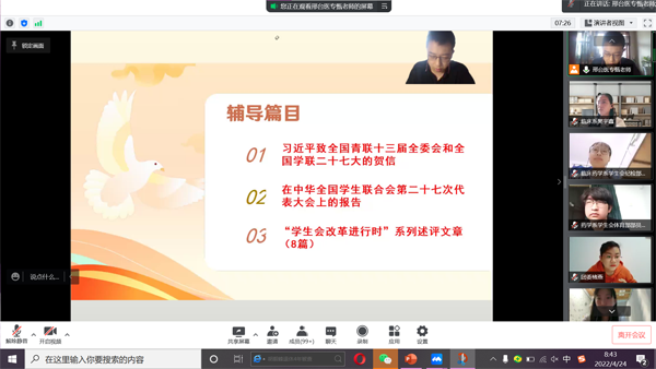随后,团委副书记甄帅以《习近平致全国青联十三届全委会和全国学联二十七大的贺信》《在中华全国学生联合会第二十七次代表大会上的报告》和《“学生会改革进行时”系列述评文章(8篇)》三个篇目为主要内容,通过关键词+案例的形式为学员们做了生动的宣讲;全体学员一同学习了学生会相关的规章制度并重温了习近平总书记在庆祝中国共产党成立100周年大会重要讲话以及大会上共青团员、少先队员代表集体致敬词的视频。