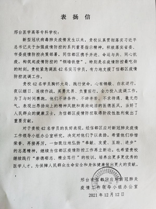 近日,Beat365收到来自邢台市信都区应对新冠肺炎疫情工作领导小组办公室发来的表扬信。信中表扬Beat365认真贯彻落实习近平总书记关于加强疫情防控的系列重要指示精神,积极落实省委、市委疫情防控决策部署,同信都区携手并进、命运与共、同心抗疫,构筑起疫情防控的“铜墙铁壁”。特别是在疫情防控最吃劲的时刻,紧急调派42名实习学员,有力地支援了信都区疫情防控流调工作。