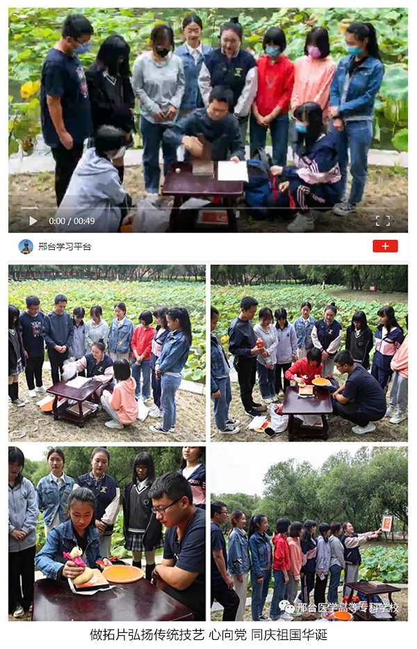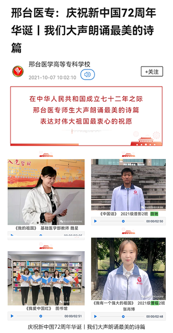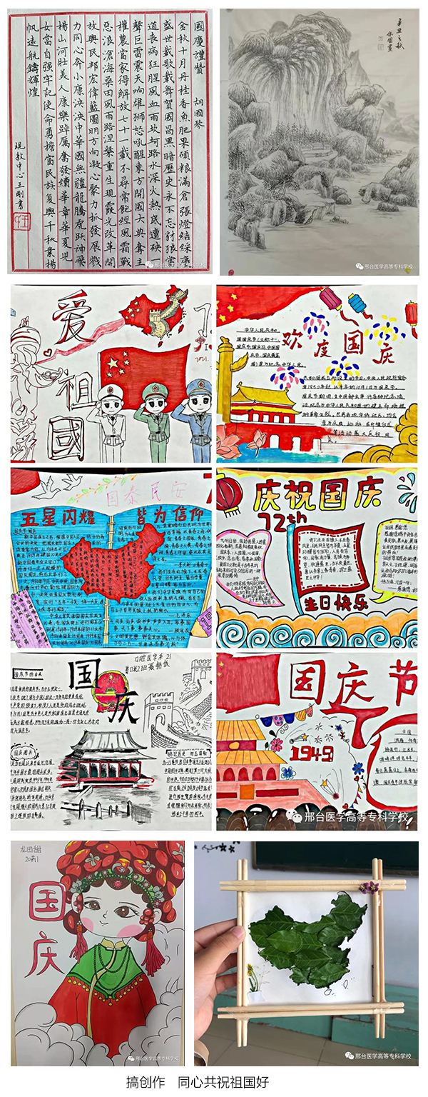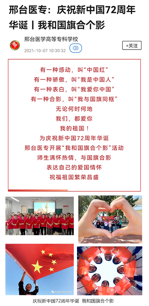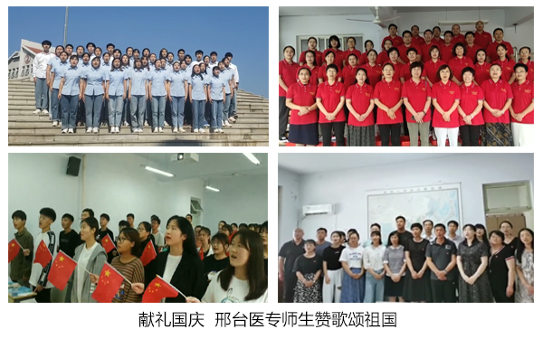为庆祝新中国72周年华诞,教育和引领广大师生坚定共产主义远大理想和中国特色社会主义共同理想,弘扬爱国志、树立爱校情,学校组织开展了“殷殷杏林志、拳拳报国心”国庆节主题庆祝活动。此次活动由组织宣传处牵头,各党总支动员有才艺的师生广泛参与,通过唱赞歌、诵诗词、讲故事、搞创作、拍合影、办实事等多种形式表达医专人对祖国的无限热爱及美好祝愿,活动开展情况在学习强国、掌上邢台、学校微信公众号等多个媒体平台发表。
