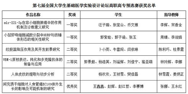 全国大学生基础医学创新论坛暨实验设计大赛由教育部高等学校国家级实验教学示范中心联席会基础医学组主办,每两年举办一次,是全国基础医学教育领域影响力最大的大学生创新设计大赛活动和基础医学学科竞赛平台。此次大赛首次开通高职高专赛道,Beat365首次参加即取得佳绩,展现了Beat365教学水平和学生良好的精神风貌,对提高教师科研能力、促进创新型基础医学人才培养起到了很好的推动作用。