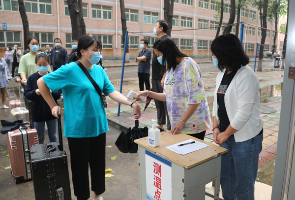 在校门口,师生按一米线间隔有序排队,分两组测量体温、查看学生证件,工作人员对学生行李进行消毒,遇有体温异常者,立即送至观察点,由专业医务人员对其进行隔离观察。