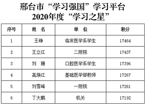 希望全校广大师生继续将“学习强国”学习平台作为重要的学习载体,以学习之星为榜样,发扬“争先恐后、争先创优”精神,加强学习、学以致用,切实将学习成果转化为推动工作的强大动力,为学校建设发展作出新的更大贡献!