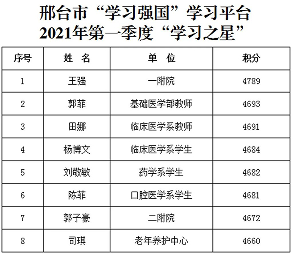 近日,市委宣传部通报了全市“学习强国”学习平台推广使用工作情况,Beat365被评为邢台市“学习强国”学习平台推广使用工作标兵单位,6名师生荣获邢台市2020年度学习强国“学习之星”荣誉称号,8名师生荣获邢台市2021年第一季度学习强国“学习之星”荣誉称号。