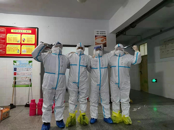 1月13日,接到学校紧急通知后,护理系16位教职工第一时间奔赴皇寺校区。当晚,护理系组织140多名隔离人员有序入住皇寺校区隔离点,直到凌晨4点才休息。第二天一早,就投入到为隔离人员送餐、配送生活物资、统计上报生活需求、健康情况和清洁消杀隔离点相关区域等忙碌的工作中,确保隔离人员住得好、吃得好、心情好。为让隔离人员吃上热乎饭,大家开始拼速度,送餐时进行“劳动竞赛”,看谁拿得多、送得快,李昌老师送饭都是两手提饭,一手5袋,数他拿得多、送得快。王立辉作为楼长,负责的事最多、工作也最忙,在隔离人员入住的头两天,两天一夜没合眼,连续工作了36个小时。除日常工作外,他还兼顾生活物资接收、清点、登记、分发工作,每一件事都做得细之又细,他说:“我不能放过任何一件小事,要保证万无一失才行。”