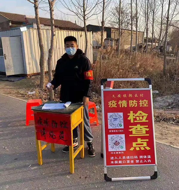 2020级普中医一班韩子坤同学在廊坊市文安县刘么乡韩么村参与疫情防控志愿服务,负责驻守村口核实健康信息,为过往人员测量体温,严把疫情重要关口,帮助村民办理出入证等证件,24小时坚守岗位,协助工作人员耐心劝导疏散聚集人群,常常在村内微信群转发防护常识、传递抗疫正能量,鼓励大家树立信心、共度时艰,真正做到了事事有回音、件件有着落,为打赢抗击新冠肺炎疫情战贡献了自己一份力量!