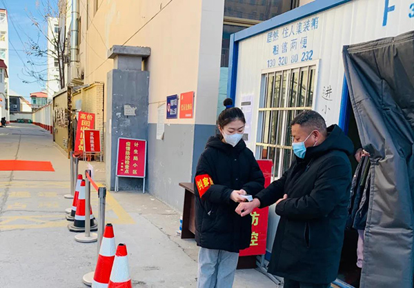 2020级普中药1班李佳怡同学在保定市安新县计生局小区参与志愿服务,负责为来往人员测量体温、做好信息登记、宣传疫情防护常识等,尽己所能为家乡防疫贡献一份青春力量。