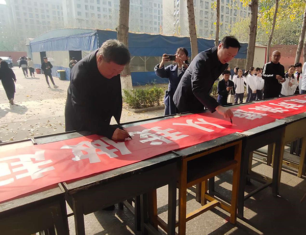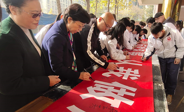 在签名活动中,党委书记田德荣,党委副书记、校长郑书深也参与进来,与在场的师生们一起在“厉行节约、反对浪费、从我做起”的红色条幅上签名。