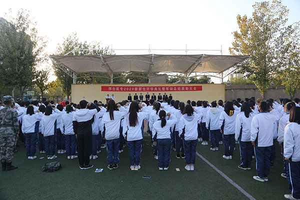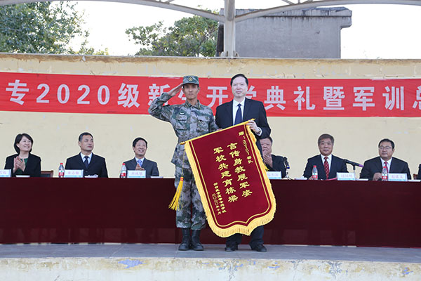 学校党委副书记、校长郑书深在典礼上致词。他首先代表全校师生员工,对2020级新同学的到来表示热烈欢迎,对各位教官的辛勤付出表示衷心的感谢,就学校的办学历史、办学格局、办学成果以及专业设置、师资力量、人才培养等作了简要介绍。郑校长对新生提出三点希望:一是以梦为马,不负韶华,与理想誓约。要在与祖国共奋进、与时代相偕行的新征程中,勇敢承担起历史赋予我们的光荣使命。二是无惧艰险,乘风破浪,与奋斗为伍。要站在最前沿,以立足于解决人类发展共同面临重大问题的高度去学习和探索。三是心在最高处,根在最深处,与医专共荣。要秉承“团结、拼搏、务实、创新”和“崇德、砺志、精业、笃行”的校风校训,培养热爱母校的深厚情感,形成爱校如家的浓厚氛围,为学校事业发展贡献智慧和力量,同时也成为母校的骄傲与荣光。
