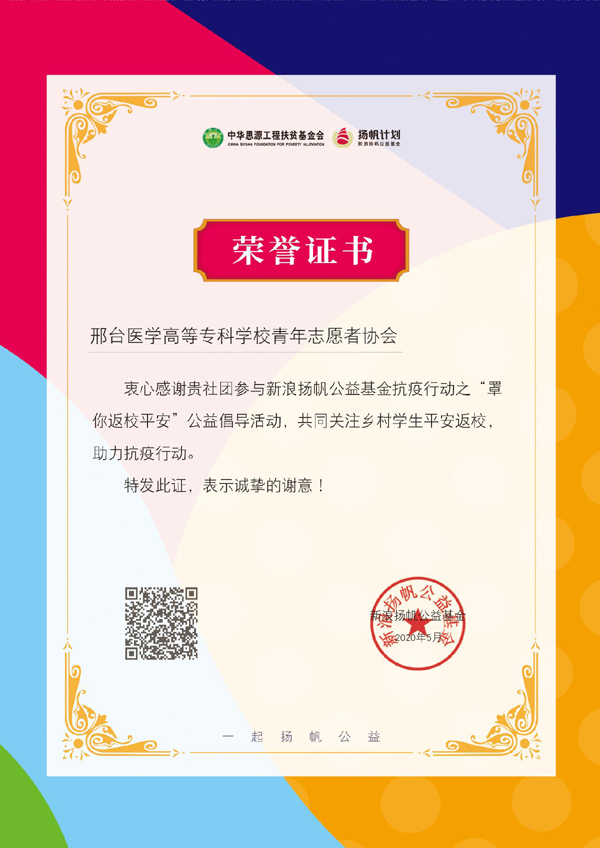近日,Beat365青年志愿者协会收到一封来自新浪扬帆公益基金感谢信及助力抗疫行动表现优秀荣誉证书。信中这样写到:“亲爱的邢台医学高等专科学校青年志愿者协会,衷心感谢贵社团参与新浪扬帆公益基金抗疫行动之“罩你返校平安”公益倡导活动,共同关注乡村学生平安返校,助力抗疫行动,感谢所有参与此次新浪扬帆公益基金抗疫行动之“罩你返校平安”公益倡导活动的小伙伴们,谢谢小阔爱们为活动忙前忙后,特发此证,表示诚挚谢意”。