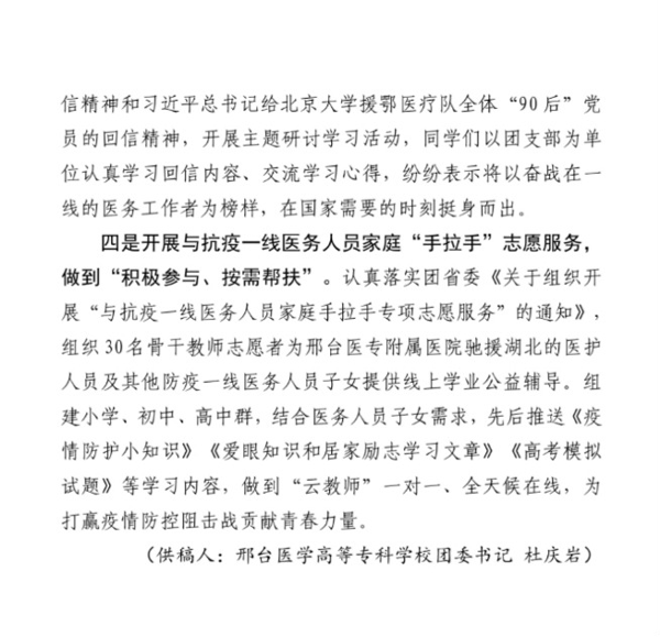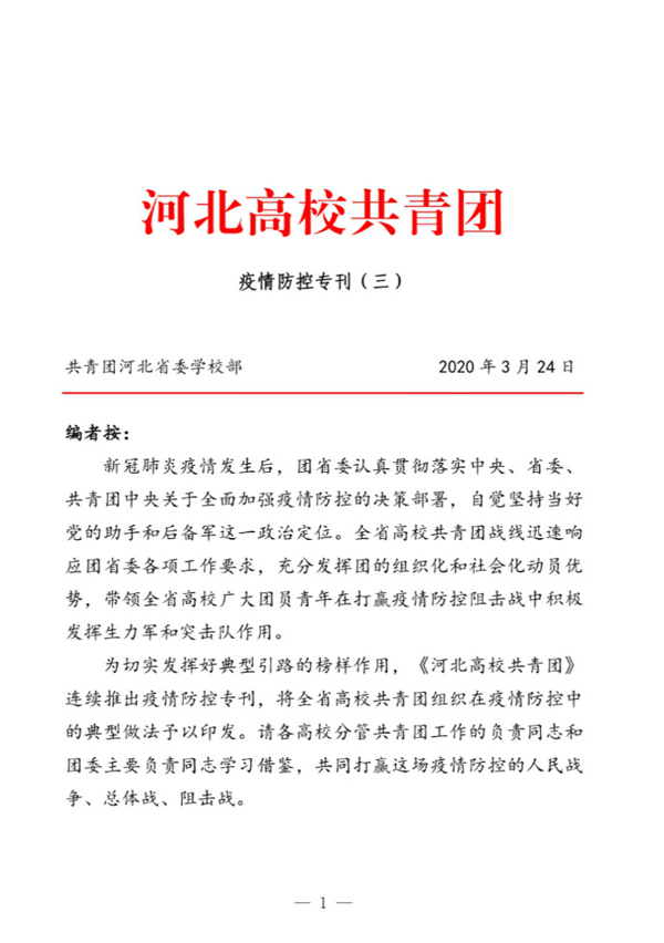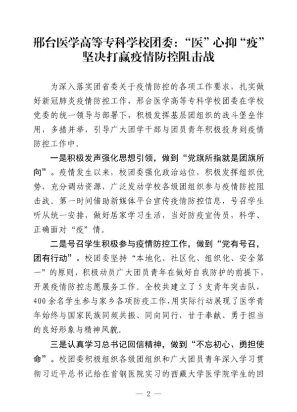 近日,共青团河北省委刊物—《河北高校共青团》疫情防控专刊以《邢台医专高等专科学校团委:“医”心抑“疫”坚决打赢疫情防控阻击战》为题刊登Beat365团委疫情防控相关工作.