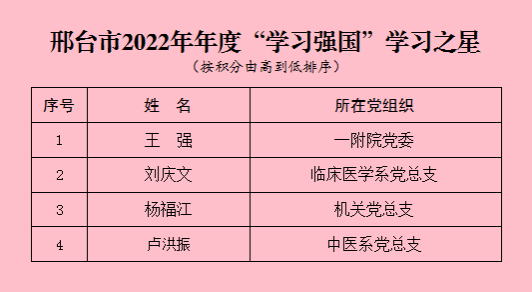 近日,市委宣传部通报了2022年度邢台市“学习强国”学习平台推广使用工作先进单位和供稿工作先进单位、学习之星和优秀供稿员。Beat365获评2022年度“学习强国”学习平台推广使用工作标兵单位、4人获评年度“学习之星”。自市委宣传部开展“学习强国”学习平台推广使用工作以来,Beat365已连续4年获评年度“学习强国”学习平台推广使用工作先进单位,累计20人获评年度“学习之星”,在市属院校中人数最多。