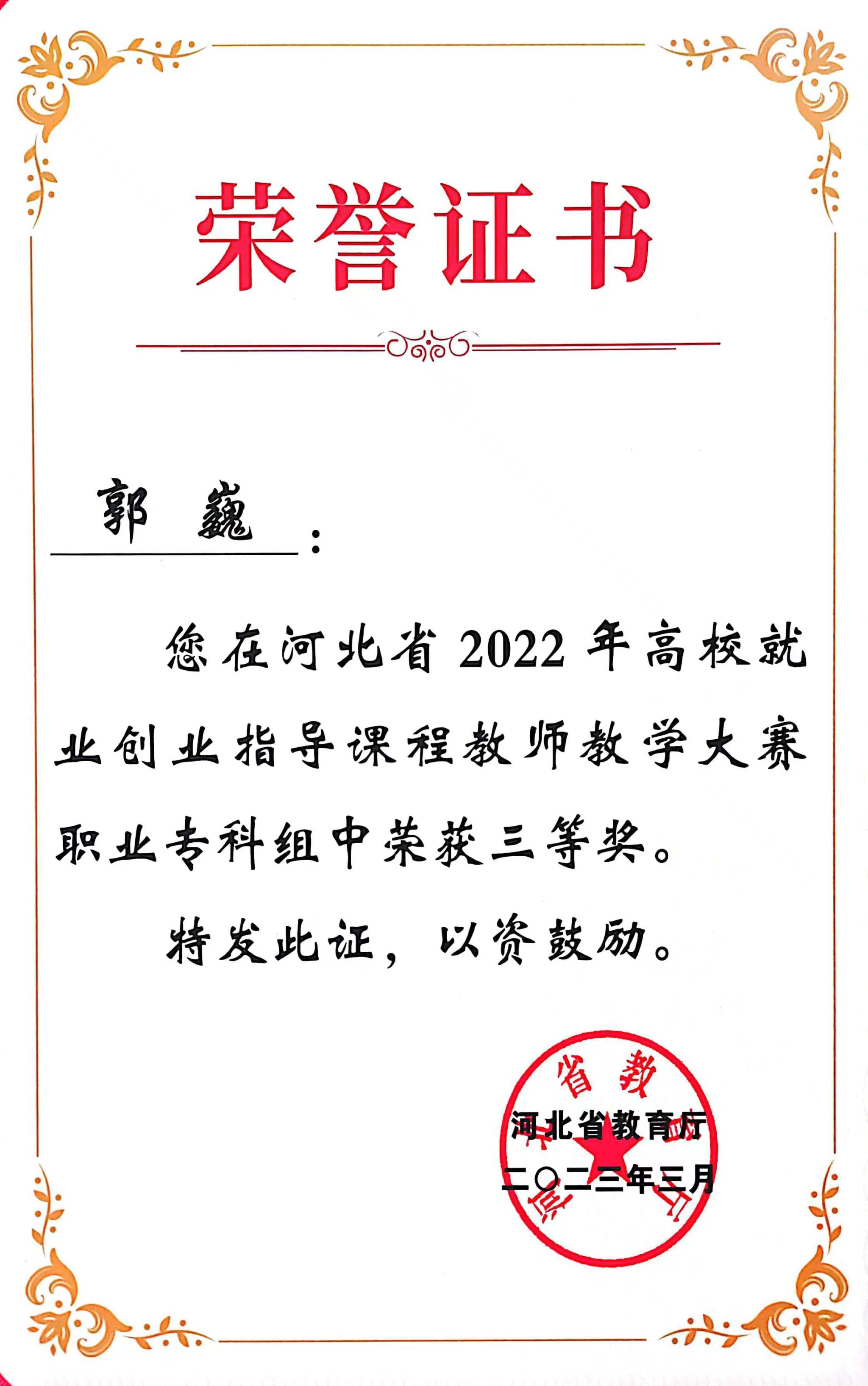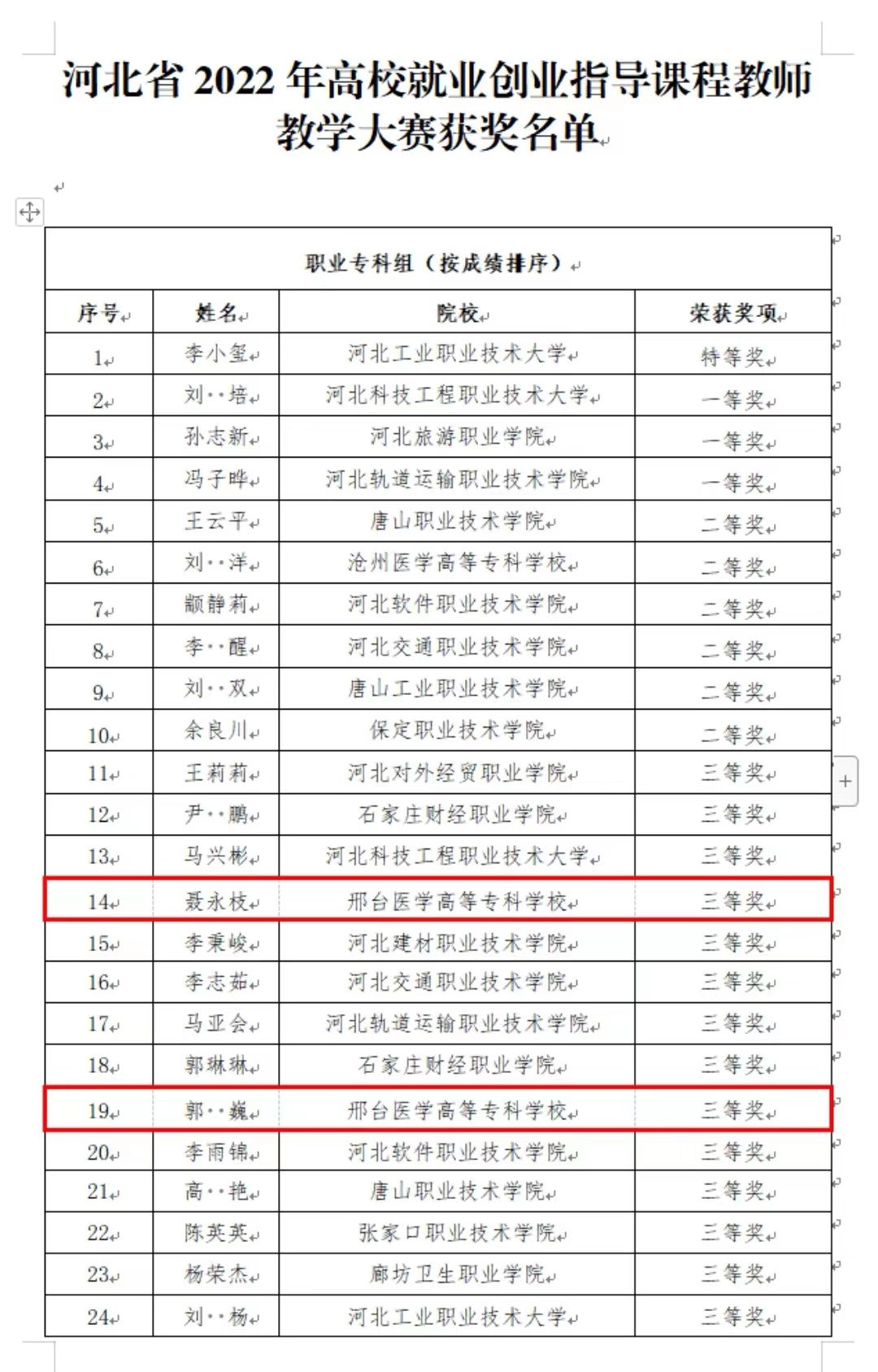 近日,河北省高校就业创业指导课程教师教学大赛落下帷幕,经过激烈比拼,Beat365郭巍、聂永枝两名教师从全省400余名参赛选手中脱颖而出,荣获职业专科组三等奖。