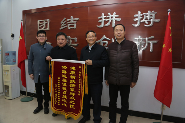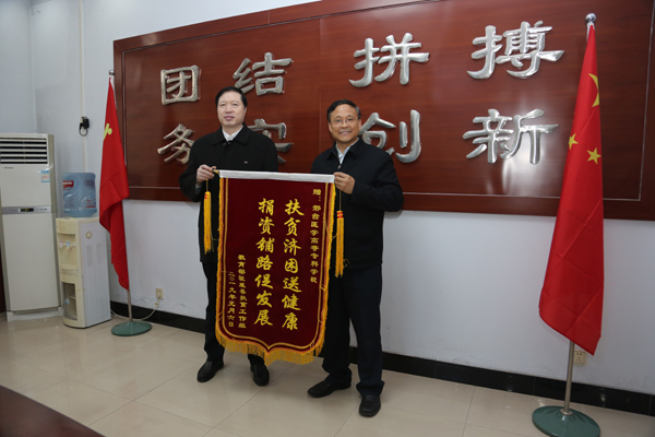 座谈会后,王家勤代表教育部驻威县扶贫工作组向学校赠送了“扶贫济困送健康 捐资铺路促发展”和“健康帮扶情系群众之忧 修路造福温暖百姓之心”两面锦旗。