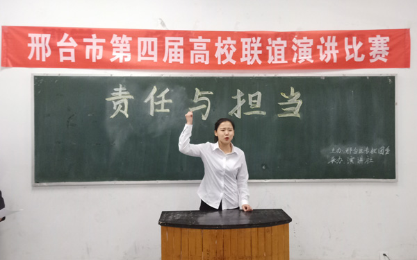 12月10日下午,图书馆一层128活动室里激情飞扬,正能量满满,一年一度的邢台市高校联谊演讲比赛火热开赛。