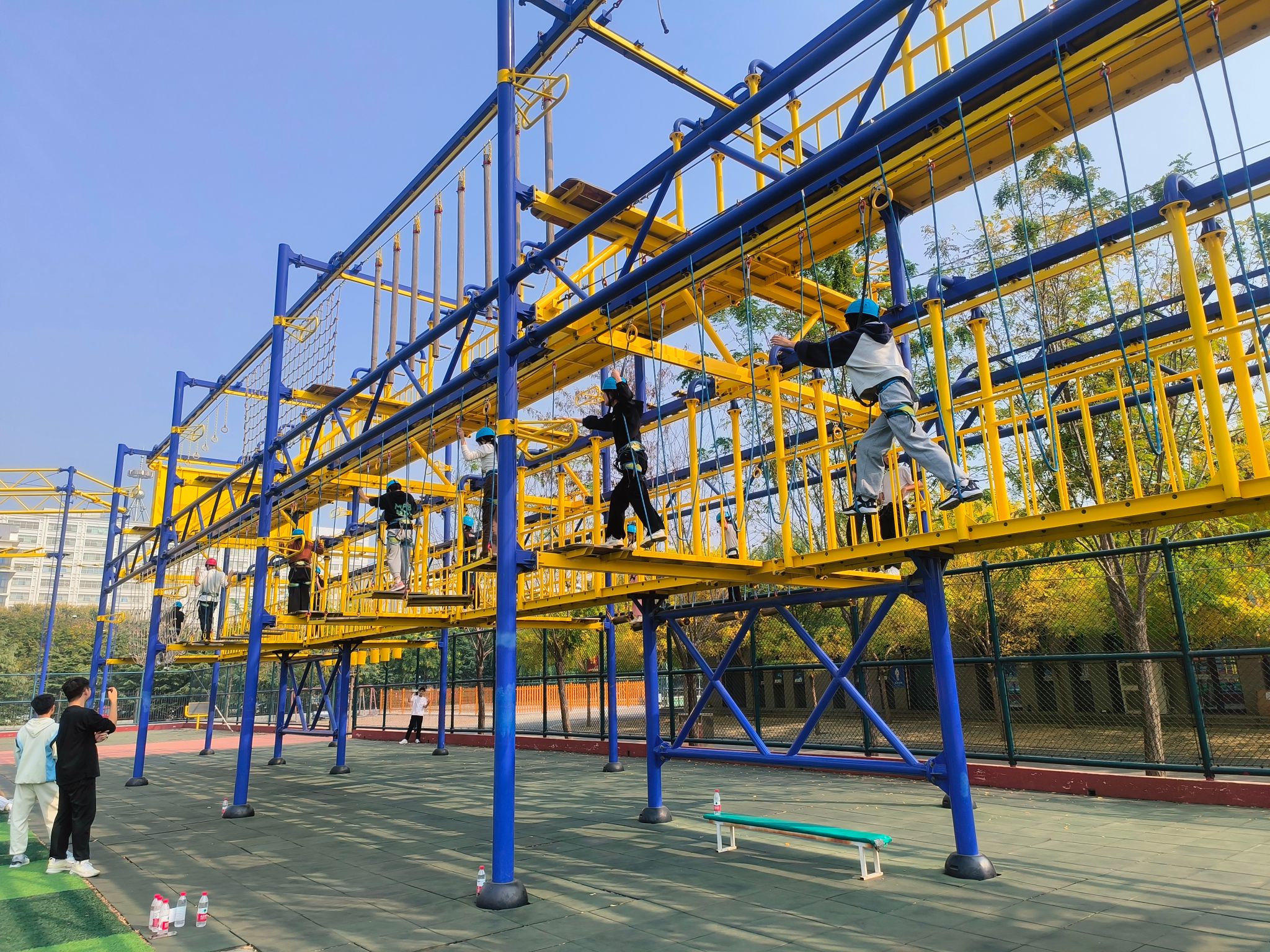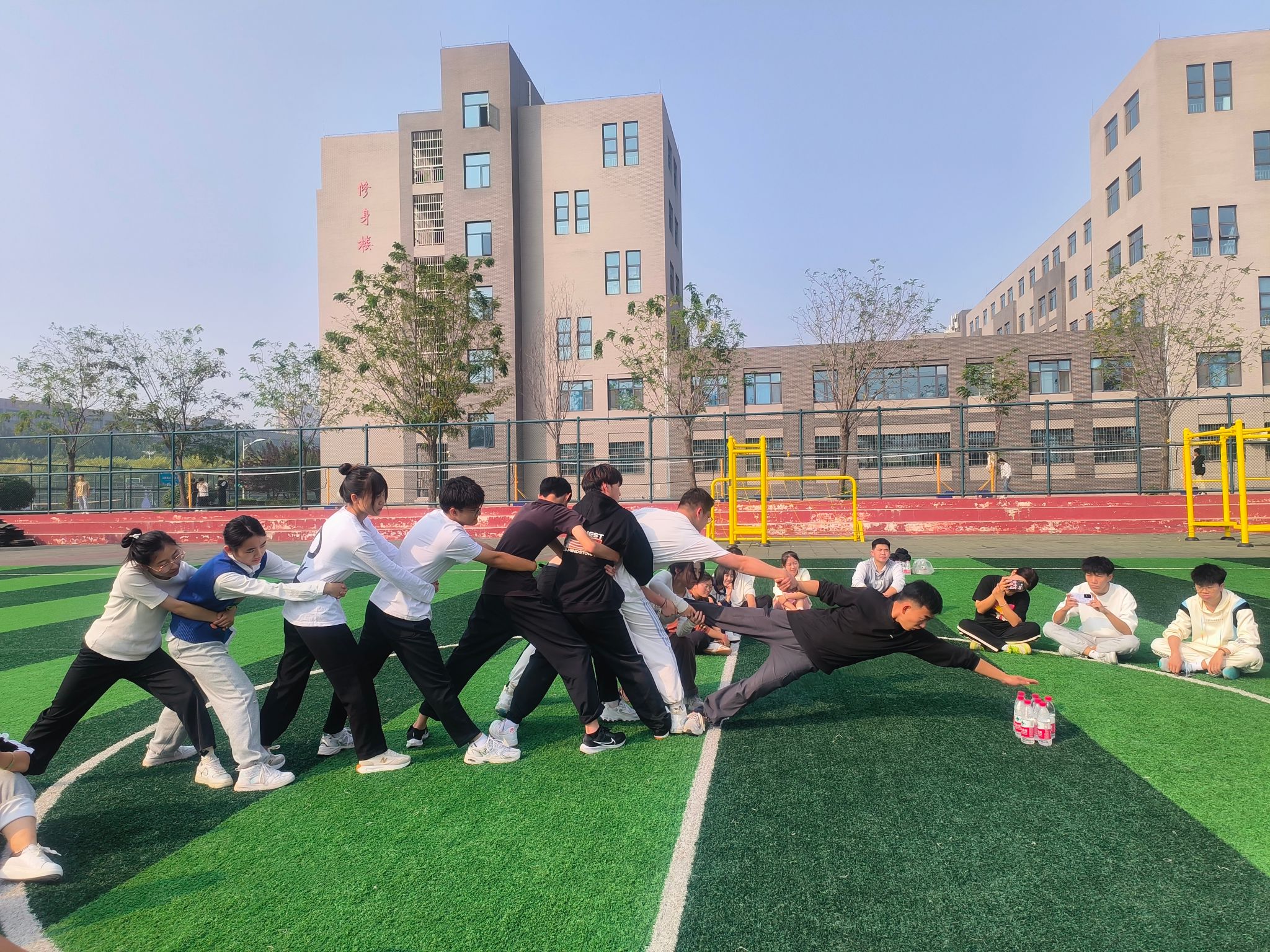 本次活动在专业素质拓展教师的带领下组织开展,主要包括安检、战地取水、空中走廊等项目。学员们在慢跑、绕肩和压腿等热身运动结束后便展开了一系列具有趣味性和挑战性并存的活动。在安检和战地取水活动中,学员们通过协商对策,默契配合,充分发挥团队的协作力量,出色地完成了各项任务;空中走廊活动中,学员们勇于突破自我,战胜自我,顺利完成了平衡木、天使之手、吊环轮胎、高板秋千、荡板桥等多项活动挑战。活动现场气氛热烈,大家在活动中提高沟通交流能力、反应能力和团队协作能力,增强责任与担当,促进了成长提升。