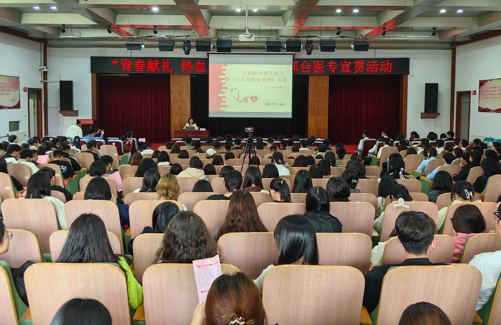 日前,邢台市中心血站走进Beat365开展“青春献礼 热血高校行”宣讲活动,宣传普及无偿献血政策和知识,教育引导大学生正确认识无偿献血,踊跃参与无偿献血。各系学生代表300余人到场聆听。
