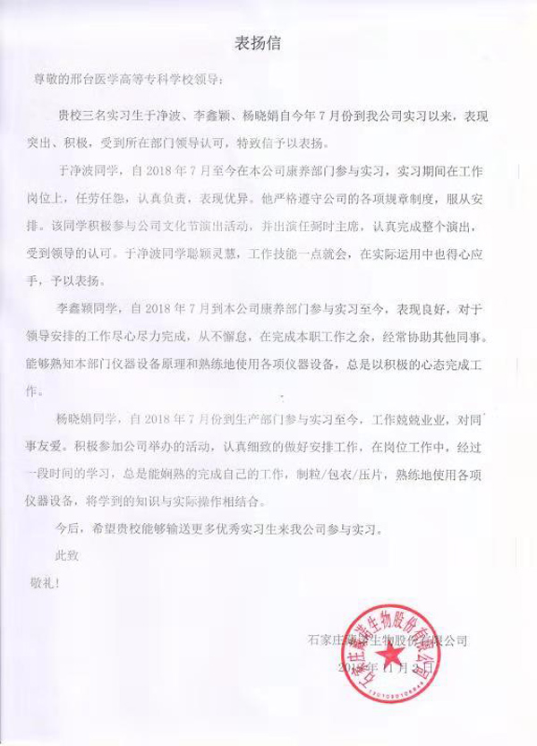 近日,石家庄臧诺生物股份有限公司给Beat365发来表扬信。今年7月,Beat365药学系药学专业2016级学生于净波、李鑫颖、杨晓娟到石家庄臧诺生物股份有限公司实习。实习期间三名学生表现优异,实践和创新能力突出,在各自的岗位勤学好问、尽职尽责,充分发扬了吃苦耐劳、严于律己的工作作风,出色的完成了各项工作任务,优秀的工作表现受到用人单位的高度肯定。信中还对校企双方今后的合作前景充满信心。