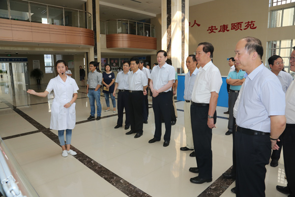 调研组一行首先来到学校第三附属医院,听取了工作人员关于学校一校三院一中心的简要介绍,在学校领导田德荣、杜成旭陪同下参观了康复诊疗中心的运动治疗室、药浴熏蒸室、儿童康复室。随后来到凰寺老年养护中心,在住养老人秦淑云的房间,王培安副主任一行和老人亲切攀谈,详细了解老人的家庭成员、收入来源、住养感受,并对养护中心优美的环境和人性化管理给予了肯定。