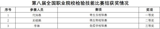 在第八届全国职业院校教师检验技能竞赛中,Beat365教师按照竞赛标准反复练习形态鉴别、试剂配制、样本提取和结果分析研判等操作,多次进行模拟训练,在比赛中拼搏进取、奋勇争先,从来自全国80余所高职院校的122名医学检验技术专业教师中脱颖而出,医疗技术系教师代旭磊以总分第一的成绩荣获寄生虫检验赛项一等奖,史晓鹏老师荣获微生物检验赛项二等奖,李琳老师荣获免疫学检验赛项三等奖。