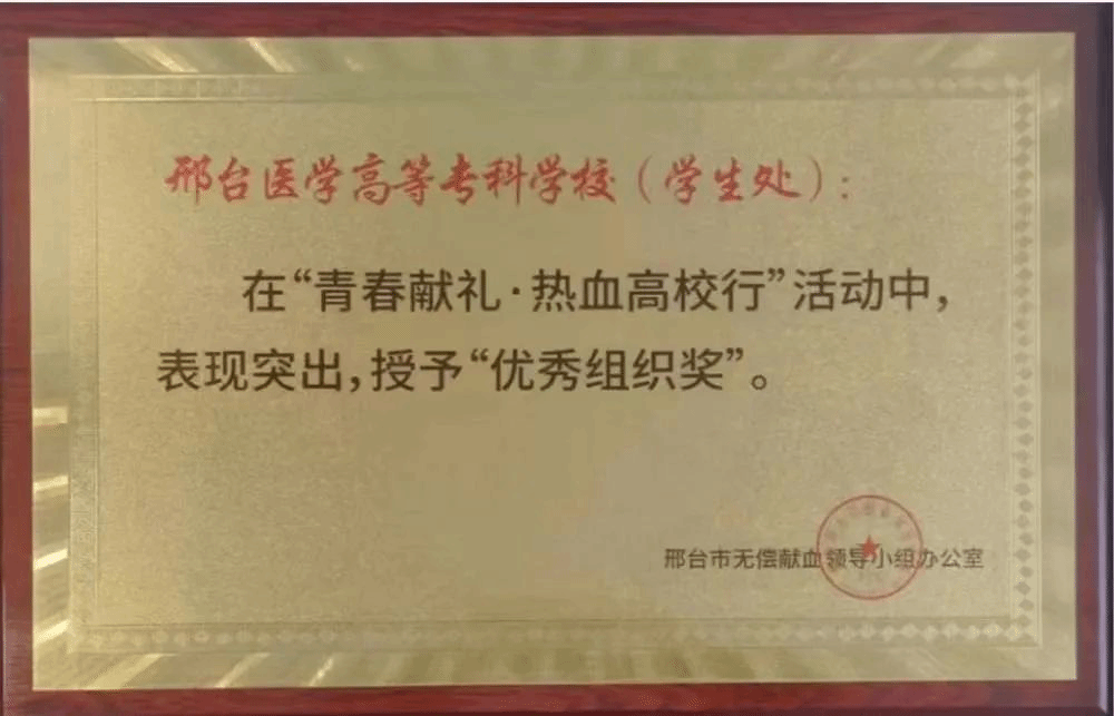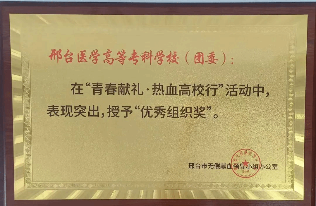 为教育引导青年学生积极投身公益事业,弘扬志愿者精神,Beat365联合邢台市中心血站,在2023年度积极开展了以“青春献礼·热血高校行”为主题的无偿献血和无偿献血知识宣传普及活动。近期,Beat365(学生工作处、团委)被邢台市无偿献血领导小组办公室授予“优秀组织奖”。