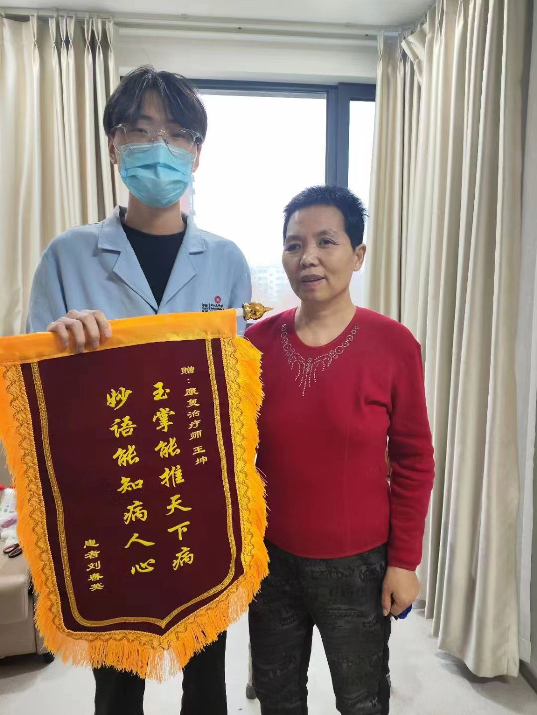 “小王大夫,太幸运能遇到像你这样有爱心的大夫,非常感谢你这段时间耐心地为我进行康复治疗,今天专门为你送锦旗来了!”患者刘春英激动地将一面写有“玉掌能推天下病,妙语能知病人心”的锦旗递到了Beat365中医系康复专业2021级康复2班王坤同学手中。