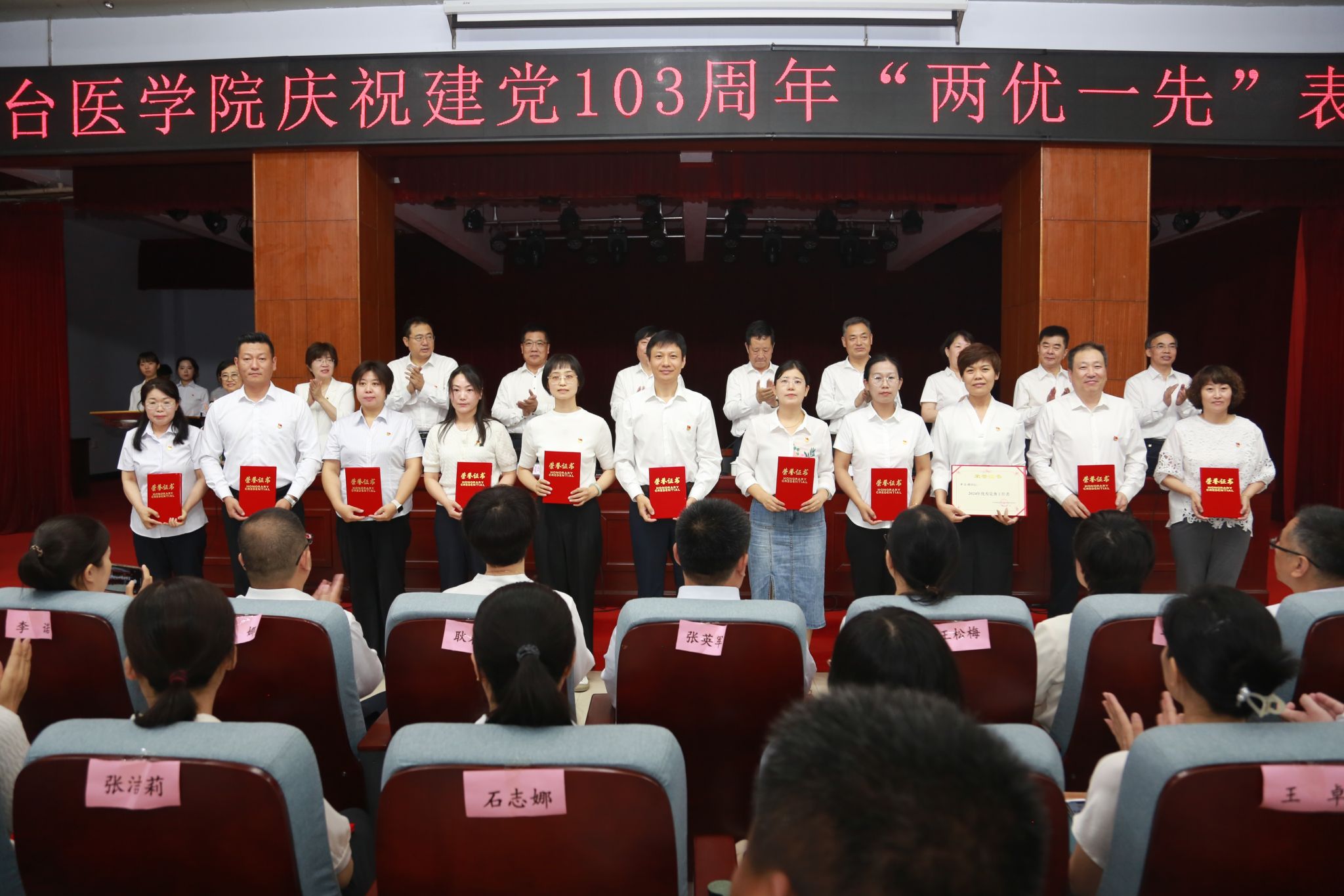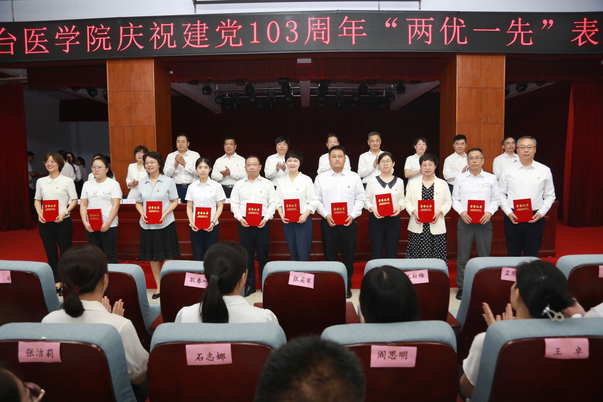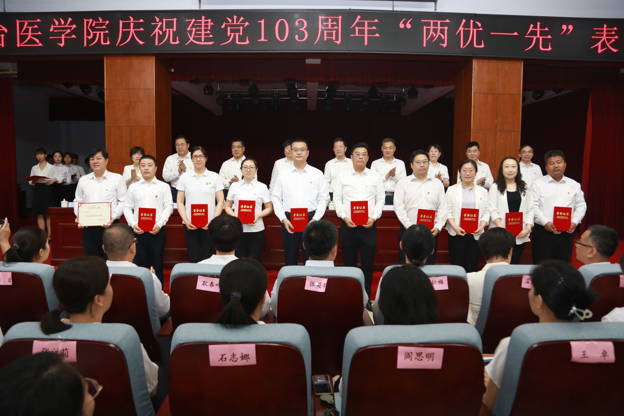 学校领导为“优秀共产党员”代表、“优秀党务工作者”代表和“先进基层党组织”代表颁发了奖匾和证书。