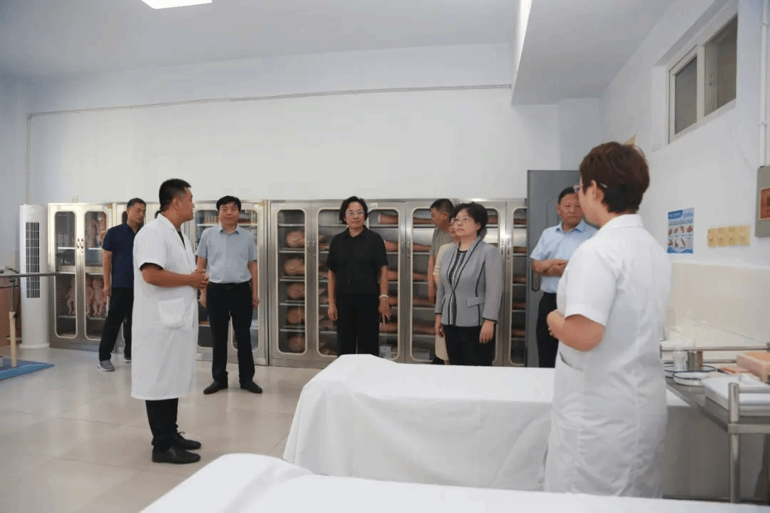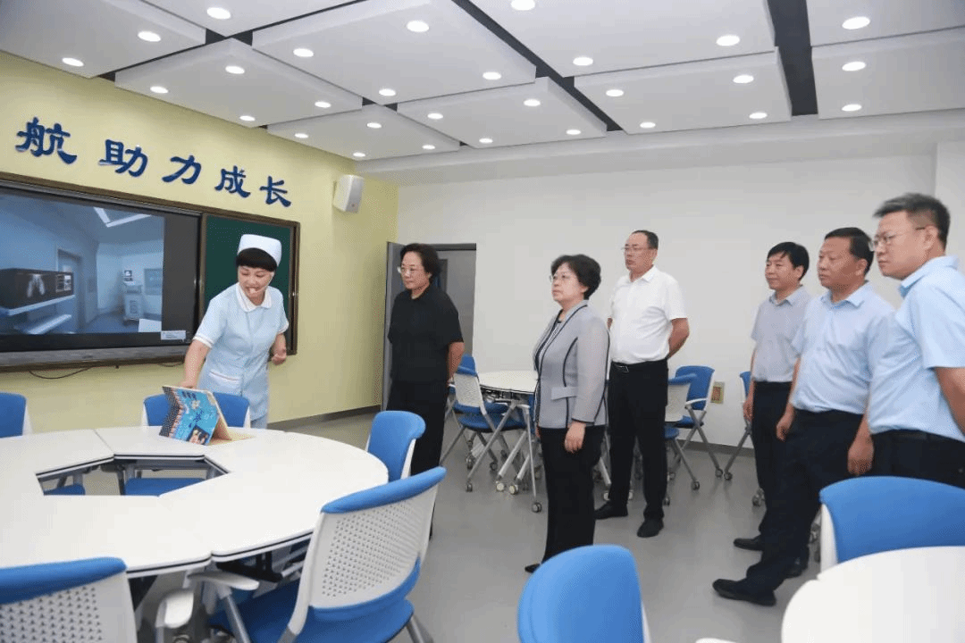 王俊华一行来到皇寺校区办公楼,参观了办学育人成果暨规划展,详细了解了Beat365历史沿革、师资培养、专业设置及附属医院建设等方面情况,并与学校党委书记、校长李建广就学校亮点工作、特色做法及未来发展规划等方面进行了交流。随后,王俊华一行实地考察学校规划建设用地,逐一观摩了居家照护实训室、康复保健实训室、儿科护理实训室、虚拟仿真实训室等教学实训室。参观中,领导多次驻足与工作人员互动交流,深入了解了学校实践教学模式及信息化教学平台建设情况,并针对人才培养、课程体系融合、校院、校企合作等方面提出了宝贵意见。