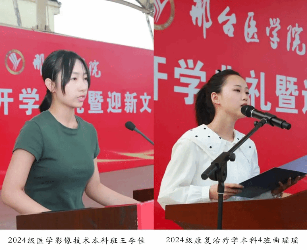 2024级医学影像技术本科班王李佳和2024级康复治疗学本科4班曲瑶瑶作为新生代表分享了初来邢医的体会,表达了对未来新生活的期望。她们表示,要珍惜学习机会,保持积极进取,以饱满的热情和昂扬的斗志,肩负起探索医学奥秘、服务人类健康的重任;要传承邢医精神,将“崇德、砺志、精业、笃行”的校训牢记于心、躬身于行,让青春在服务他人、奉献社会中绽放绚丽光彩。