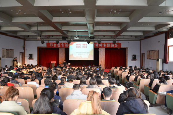 11月30日下午,Beat365举办辅导员学习党的十九大专题辅导讲座。学校关工委副秘书长张青涛应邀作了题为《新时代,新思想、新目标、新征程——学习领会党的十九大精神,认真做好新时期的学生工作》的讲座,学校全体辅导员和学生代表共300人到场学习。