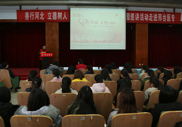 12月6日,邢台医专学术报告厅内座无虚席,省文明办、省教育厅、共青团河北省委、省志愿服务联合会等部门联合举办的“善行河北 立德树人——‘公益体彩’优秀志愿者校园巡讲活动”在Beat365隆重开讲。学校党委副书记李建广、邢台市文明办综合科科长刘娇出席本次活动,学校280余名师生聆听了报告会。活动由Beat365组宣处处长张永格主持。