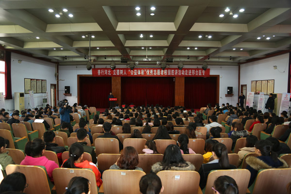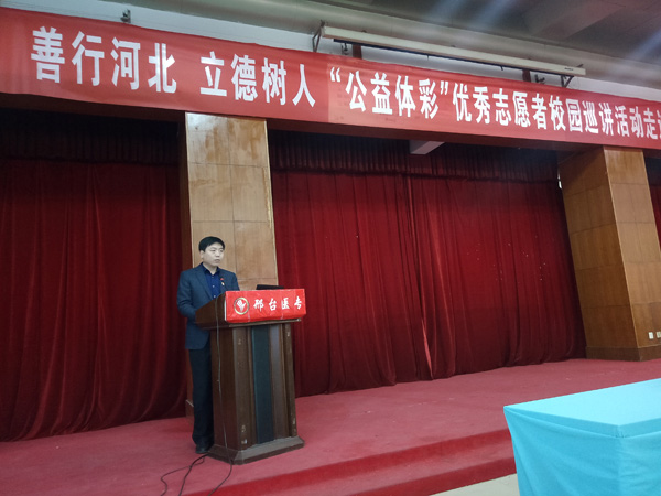 活动伊始,李建广副书记代表学校致辞,对出席巡讲的领导和优秀的志愿者们表示热烈欢迎和崇高的敬意。他指出,志愿服务是现代社会文明进步的重要标志,是培育和践行社会主义核心价值观的重要内容。多年来,邢台医专坚持立德树人的根本任务,高度重视志愿服务工作,壮大了队伍,形成了体系,打造了品牌,赢得了荣誉。学校荣获第四至七届河北省教育系统志愿服务先进单位、首批河北省志愿服务培训基地、邢台市志愿服务工作先进单位;学校“扶贫助困春雨行动”为第五届河北省教育系统优秀志愿服务品牌,党员志愿服务进社区“服务群众零距离”为第六届河北省教育系统优秀志愿服务品牌;交通协勤志愿行被评为邢台市优秀志愿服务品牌,临床系爱心接力助残团队被评为“燕赵好人”“邢台好人”;50余名志愿者荣获邢台好人、燕赵好人、中国好人候选人、省“善行河北-感动校园之星”及省、市志愿服务先进个人等荣誉。希望广大师生珍惜机会、认真学习,向优秀志愿者们看齐,以此次校园巡讲为新的起点,在中国特色社会主义新时代更好的传承和发扬志愿服务精神,为建设富强民主文明和谐美丽的社会主义现代化强国做出自己的贡献!