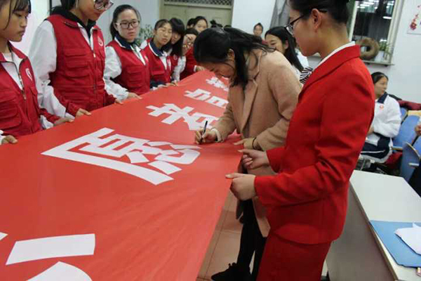 活动在全体青年志愿者高唱《青年志愿者之歌》的歌声中拉开帷幕。大家一起回顾了近年来,Beat365青年志愿服务工作和青年志愿者协会建设的基本情况。由青协代表演唱的歌曲《爱心无限,志愿同行》,用新颖的形式表达了志愿者们践行“奉献、友爱、互助、进步”的志愿服务精神的决心和信心。2016级普中医班徐亚茹同学带领全体青年志愿者进行了庄严的宣誓。2016级普中医班毛新宇同学表示,是爱心与责任引导她加入青协,也是爱心与责任让她坚持下去,今后要进一步践行志愿服务精神,让爱心永存校园,用真情贡献社会。2017级普影2班郑佳兴同学代表新生发言,表示要在帮助他人的实际行动中,体会志愿服务的快乐,以诚待人,培养自己的责任精神。最后,全体同学在条幅上签名,表达了脚踏实地、甘于奉献、践行自己对社会承诺的决心。