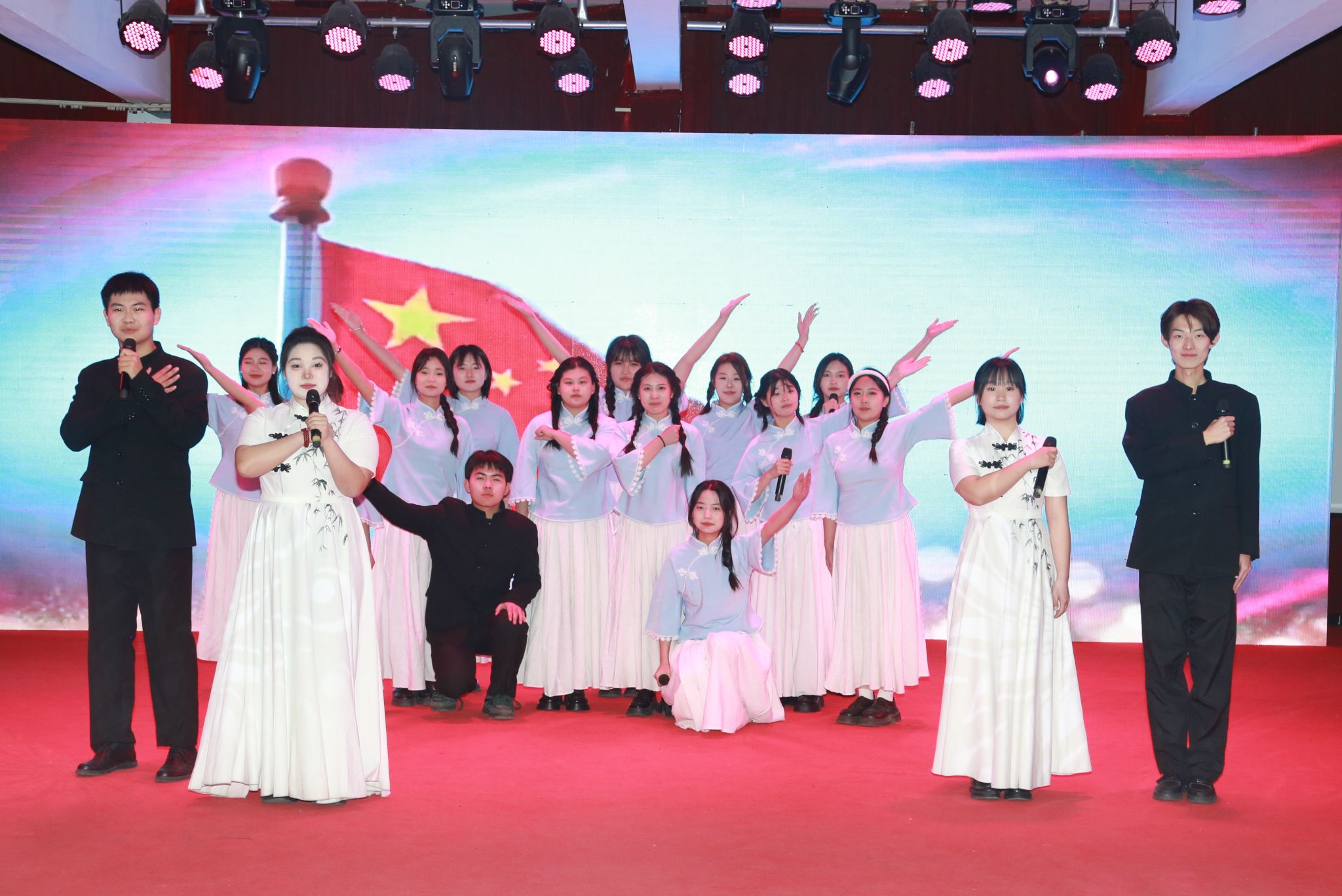 大学生艺术团带来的开场舞《领航》以其恢弘的气势,展现了全校师生坚定跟随党的领航步伐,砥砺奋进、阔步迈向新时代新征程的蓬勃朝气,瞬间点燃了全场观众的热情,也为晚会奠定了庄重热烈、昂扬奋进的基调。随后,精彩节目轮番上演,《读中国》《啊,中国的土地》,通过深情地演绎,表达了对祖国广袤大地的无限眷恋与热爱。《邢医赞》回顾了邢医人在医学教育的漫漫征途中所经历的艰辛与创造的辉煌,展现了一代代邢医人团结拼搏、砥砺前行的精神风貌。学校第二附属医院与临床医学系同学们合作演绎的《你的答案》彰显了院校协同育人,培养高素质医学人才,推动医学教育事业不断迈上新台阶的坚定决心。歌曲《画你》《向云端》《我会等》《我的歌声里》以及师生联袂演出的歌曲串烧,用优美的旋律、动听的歌声传达出师生积极向上、追求梦想的生活态度,表达了对学校美好的祝福。活力四射的现代舞、爵士舞、充满民族风情的新疆舞和古典唯美的古风舞,一次次将现场氛围推向高潮,赢得欢呼声不断。乐队合奏的《春风十里》让观众们随着音乐的节奏轻轻摇摆,感受着校园生活的温暖与纯真。手语表演《乐动青春、志愿同行》以无声的语言诉说着温暖故事,诠释着青春的奉献与担当。朗诵《正青春向未来》用激昂奋进的语调许下青春的誓言,展现出当代青年学子积极向上的精神风貌。最终,附属医院与口腔医学系师生共同演绎的歌伴舞《不忘初心》,为整场晚会画上了一个完美的句号。