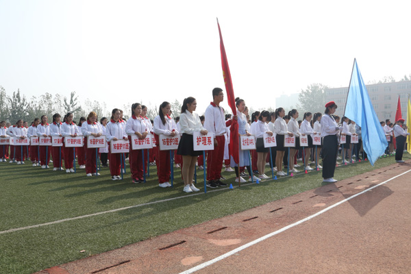 19日7时30分,隆重而热烈的运动会开幕式正式开始,开幕式由学校党委副书记李建广主持,学校领导李占华、穆吉兴、郭靠山、杜成旭、王晓明出席开幕式。伴随激昂雄健的运动员进行曲,国旗方队四人平牵鲜艳的五星红旗走在最前列,彩旗方阵、运动员方队、裁判员方队紧随其后,迈着整齐矫健的步伐,喊着铿锵有力的口号,英姿飒爽地依次经过主席台前接受检阅,独具创意的方阵,醒目的标语牌,给田径场上增添了喜庆、欢乐的气氛。入场式结束后,举行了庄严的升旗仪式,伴随着雄壮的中华人民共和国国歌,五星红旗在全校师生的注视下冉冉升起,飘扬在学校上空。