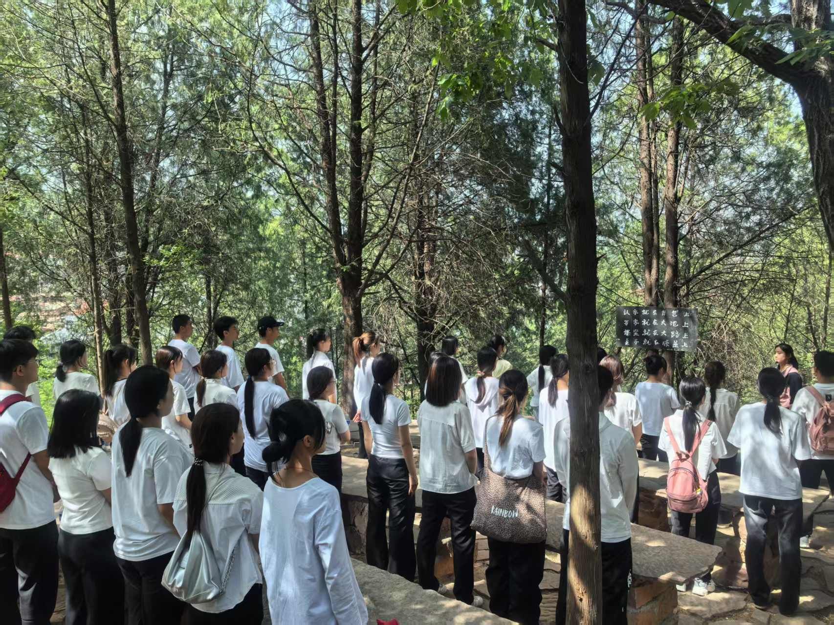 在抗大碑林,同学们认真品读碑上文字,通过字里行间感受着革命先辈们坚定的信念和炽热的理想。大家站在一排排石头课桌前,望着教学用的小黑板,仿佛穿越时空,回到战争年代,切身领略先辈们“饥饿贫穷多苦难,改天换地不畏艰”的壮志豪情。