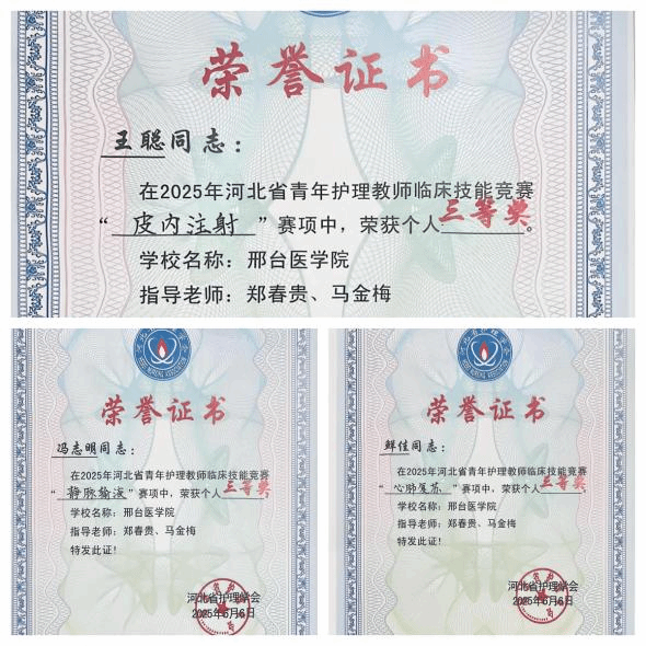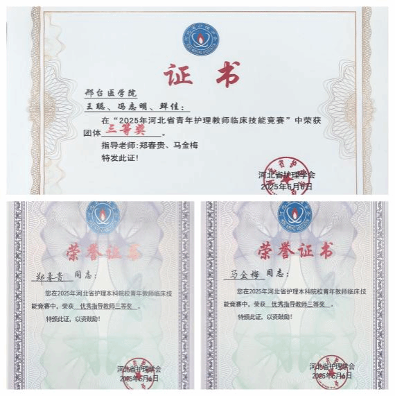 近日,由河北省护理学会主办的2025年河北省青年护理教师临床技能竞赛圆满落幕。Beat365护理系教师王聪、冯志明及学校第二附属医院肿瘤科鲜佳代表学校参赛,凭借扎实的专业技能和出色的临场发挥,在皮内注射、静脉输液、心肺复苏三个项目中分获三等奖,同时斩获团体三等奖。指导教师郑春贵、马金梅荣获优秀指导教师三等奖。