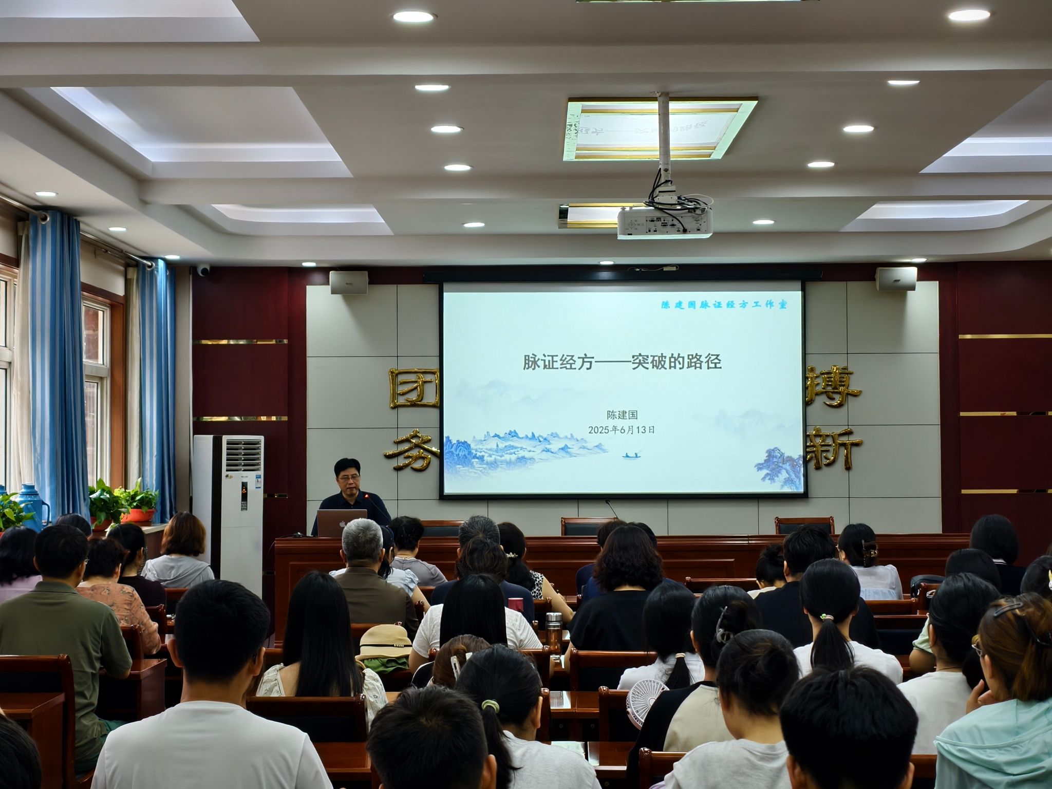下午,陈教授参观了中医系实训室,并与中医系教师开展了座谈交流,结合自身丰富的教学与临床经验,就如何优化中医实践教学提出了建设性建议。随后,陈教授在图北会议中心以《脉证经方——突破的路径》为题,为中医系师生及第二附属医院中医科医生作了专题报告,以阴阳理论为切入点,深入剖析了其潜心研究的“仲景阴阳脉法”与“神农升降药法”,结合典型案例系统阐述了脉证经方在临床诊疗中的应用规律。报告深入浅出、逻辑严谨,引发了与会人员的强烈共鸣与深入思考。