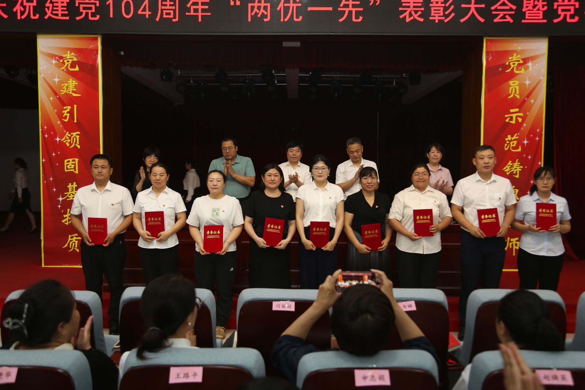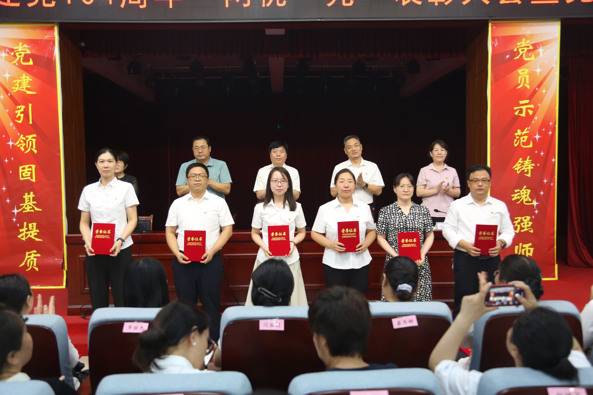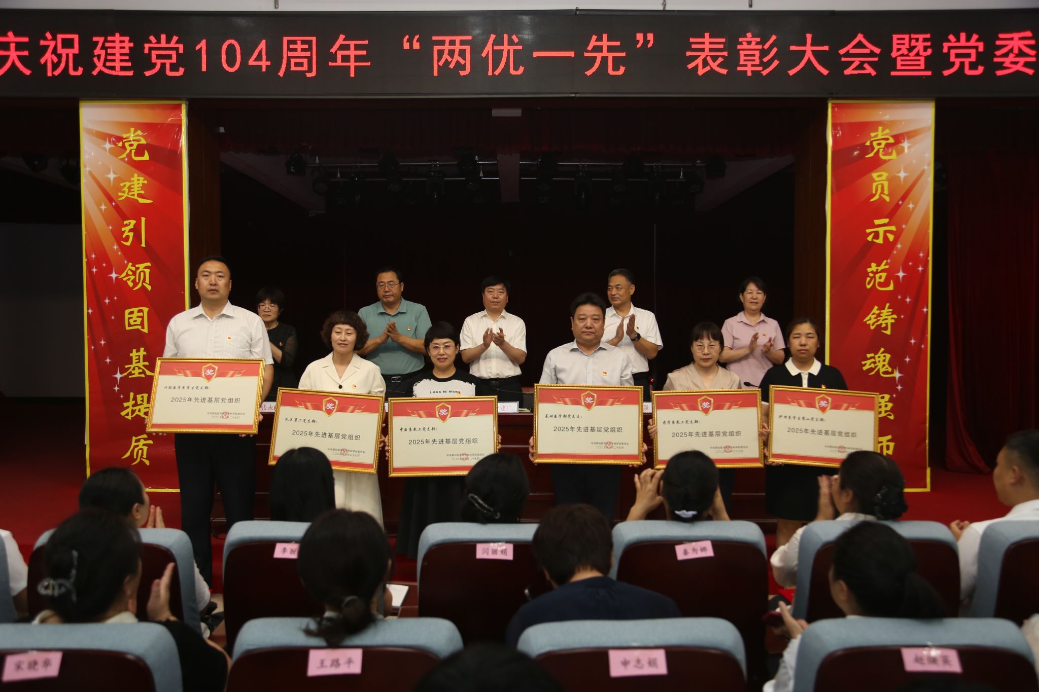 学校领导为“优秀共产党员”“优秀党务工作者”和“先进基层党组织”获奖者颁发了奖匾和证书。