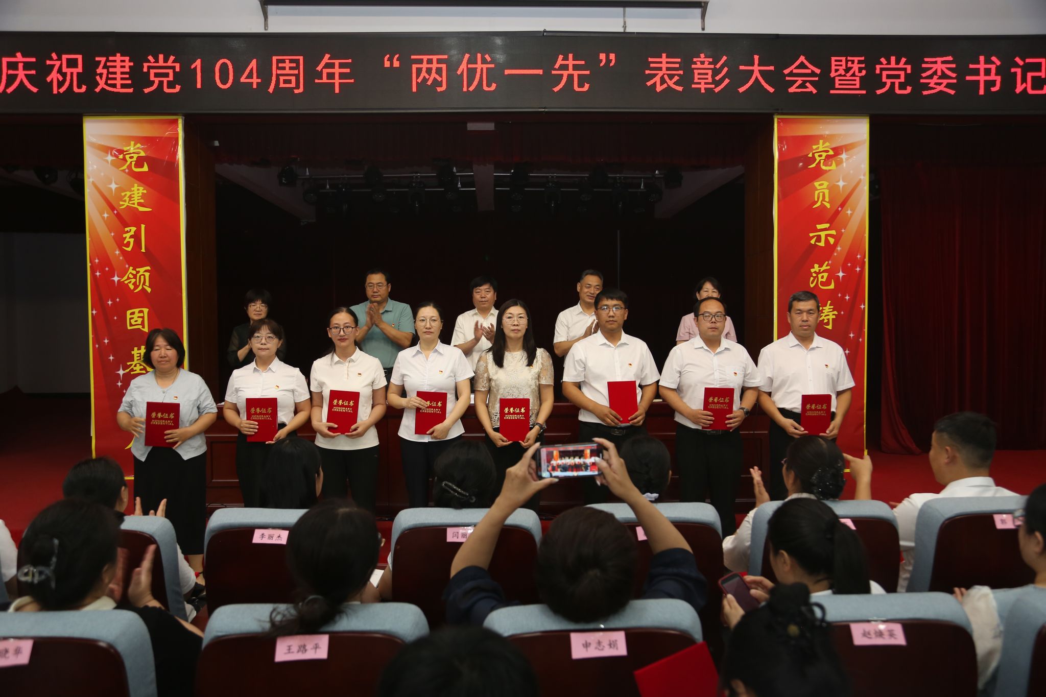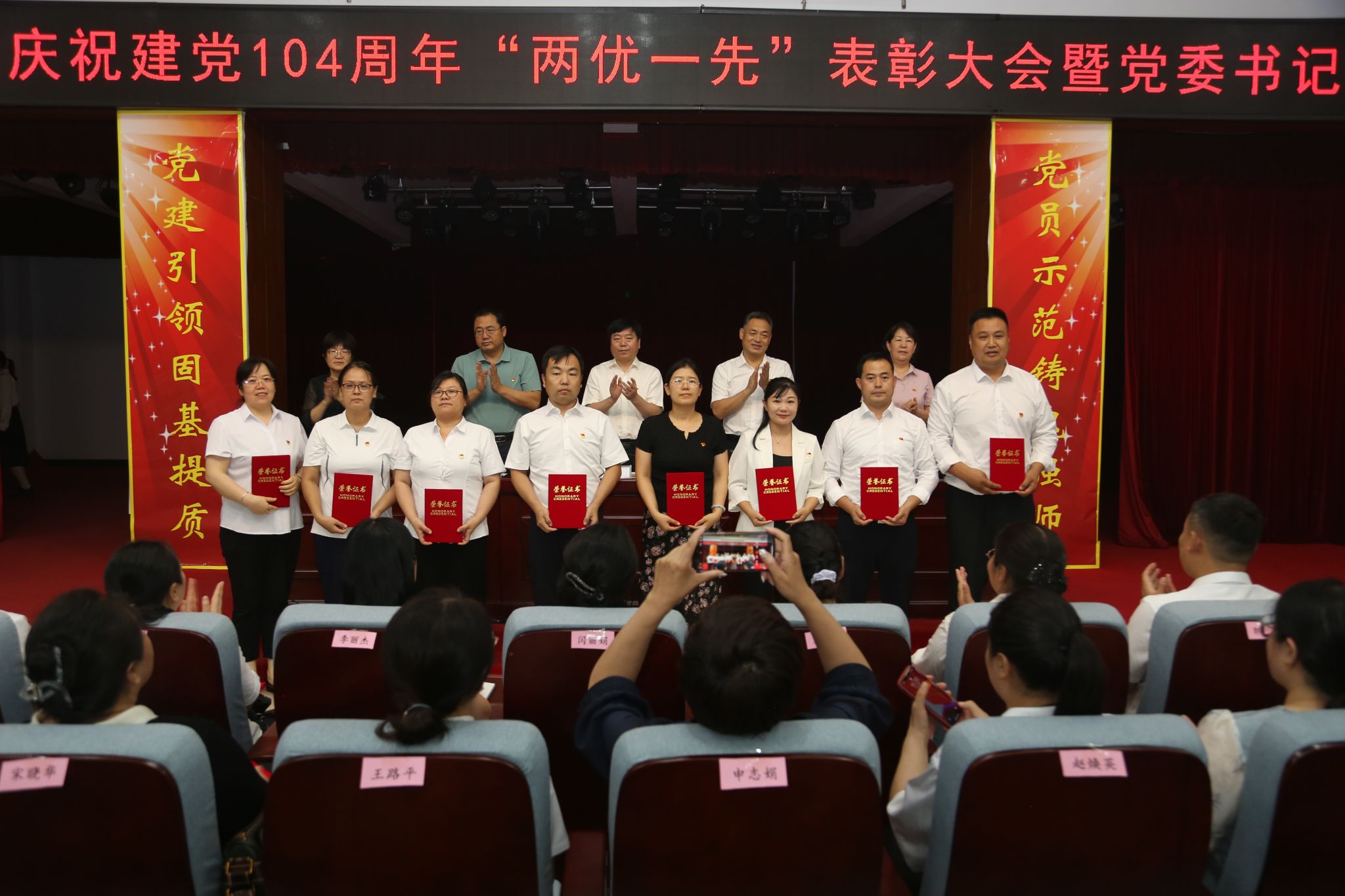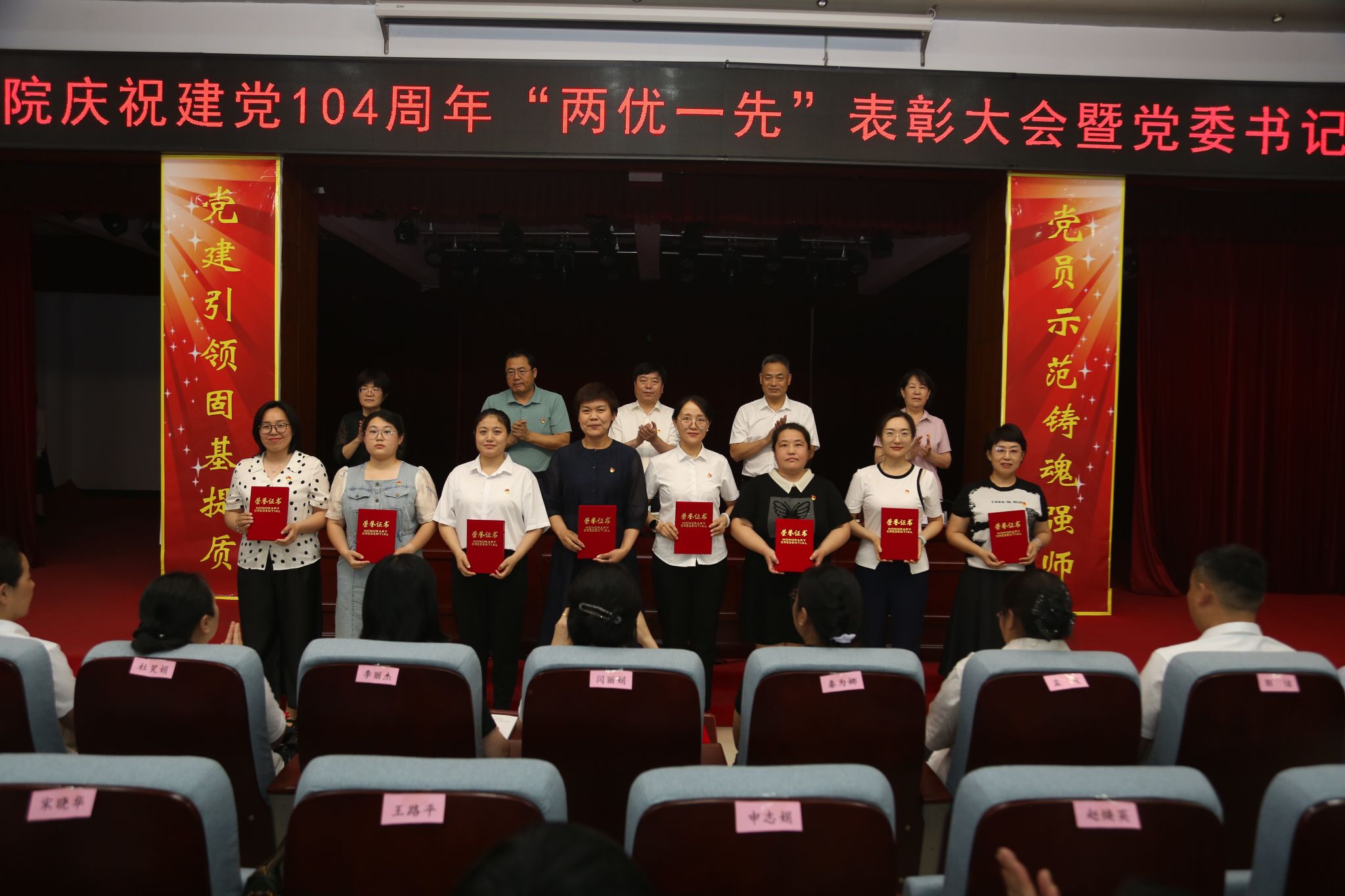 学校领导为“优秀共产党员”“优秀党务工作者”和“先进基层党组织”获奖者颁发了奖匾和证书。