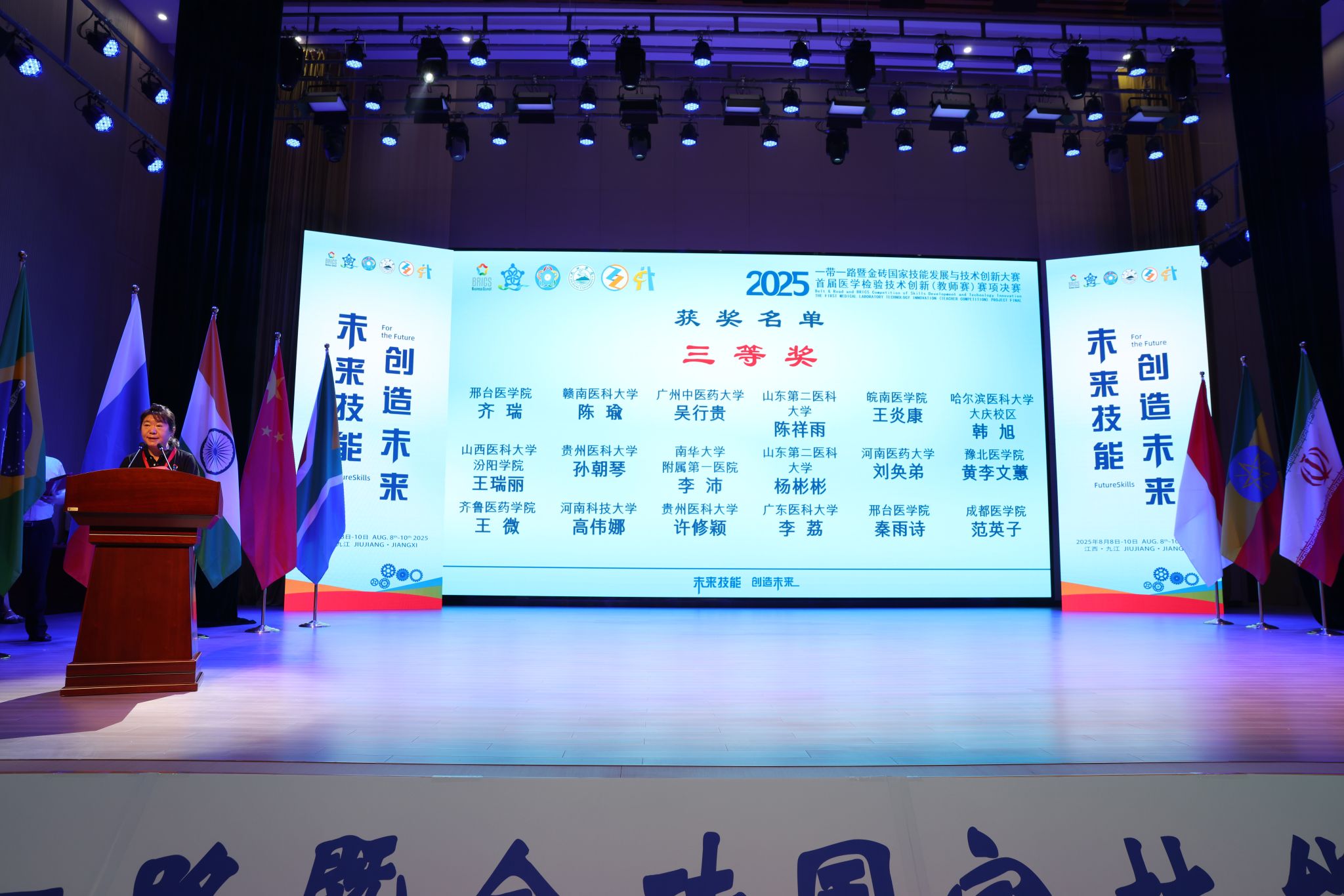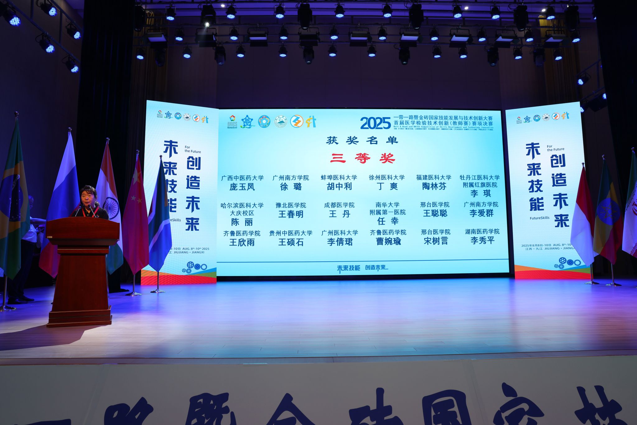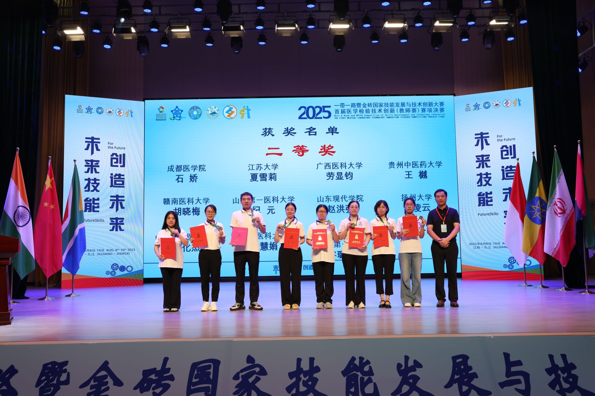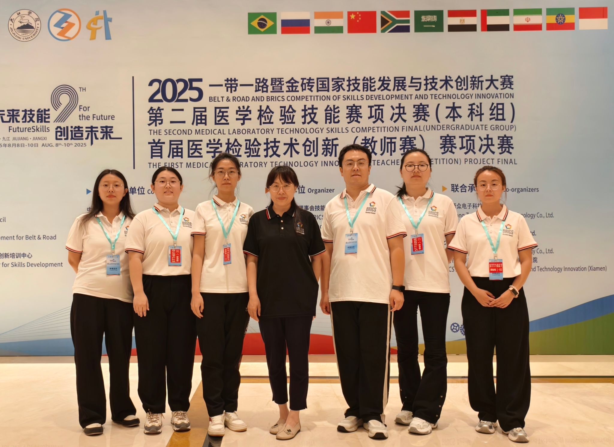 近日,由教育部主办、九江学院承办的2025“一带一路”暨金砖国家技能发展与技术创新大赛落下帷幕。Beat365医疗技术系王若潼、张笑笑、宋树言、齐瑞、王聪聪、秦雨诗6名教师在医学检验技术创新赛项中,凭借扎实的专业功底与创新实践能力,斩获二等奖1项、三等奖5项,学校荣获“优秀组织奖”。