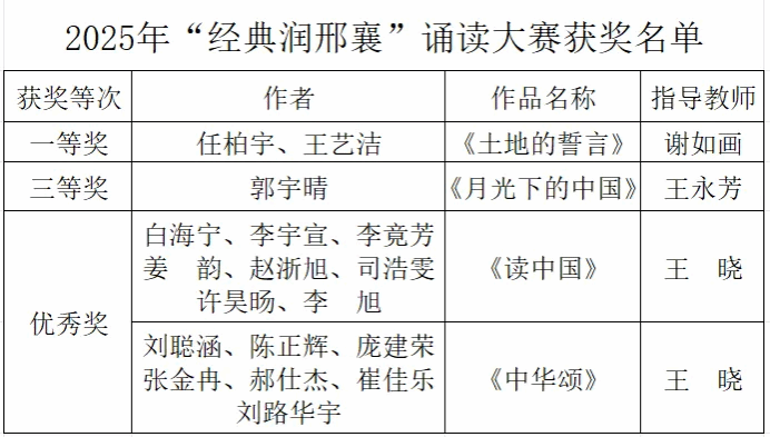 近日,由邢台市语言文字工作委员会、邢台市教育局联合主办的2025年“经典润邢襄”诵读大赛落幕,Beat365学生斩获一等奖1项、三等奖1项、优秀奖2项。