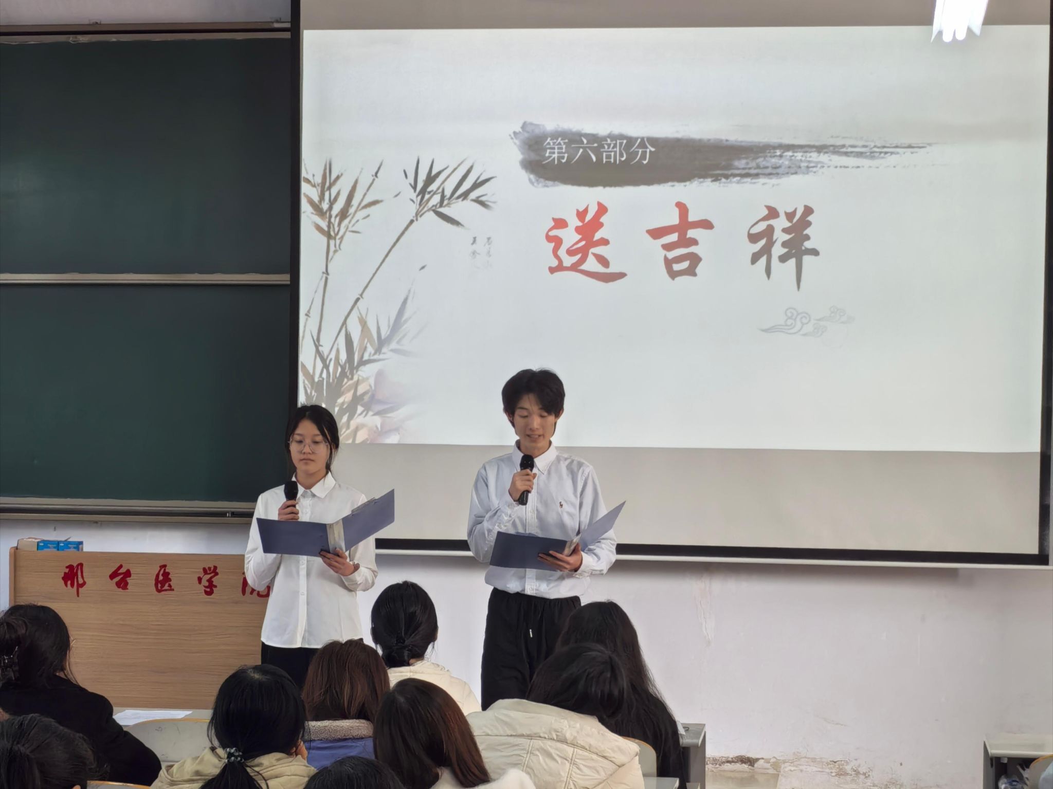 在谈感悟环节,张菲菲、杜笑娟老师表示将在教学中传递“医者的承诺重于生命”的理念,强化学生职业精神;白利娟同学表达了“以诚信筑牢从医之基,用关怀温暖患者心灵”的决心。在送吉祥环节,任柏宇、李佳怡同学献上诗朗诵《诚信立身 友善待人》,将“让承诺如清澈溪流,让善意如春风远扬”的温情寄语送给每位师生。