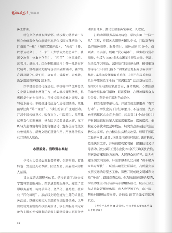经邢台市文明办推荐,Beat365精神文明工作《邢台医学高等专科学校:立德树人守初心 杏苑盛开文明花》在由河北省精神文明建设委员会办公室主办的《精神文明建设》2020年第11期刊登。