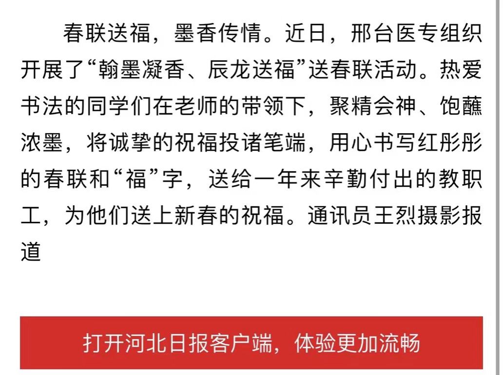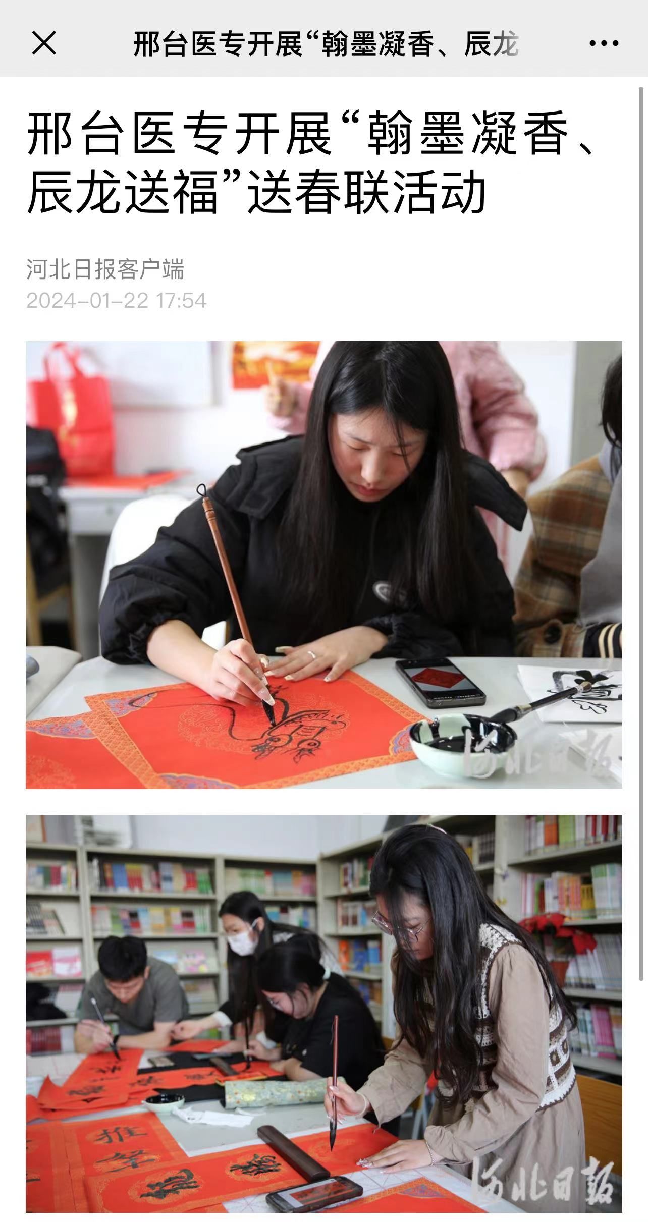 春联送福,墨香传情。近日,邢台医专组织开展了“翰墨凝香、辰龙送福”送春联活动。热爱书法的同学们在老师的带领下,聚精会神、饱蘸浓墨,将诚挚的祝福投诸笔端,用心书写红彤彤的春联和“福”字,送给一年来辛勤付出的教职工,为他们送上新春的祝福。通讯员王烈摄影报道