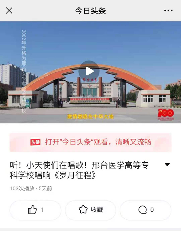 上一条:河北广播电视台冀时客户端报道“年轻肩膀扛起光荣使命,青春绽放最美光彩!邢台医专《岁月征程》MV发布”
