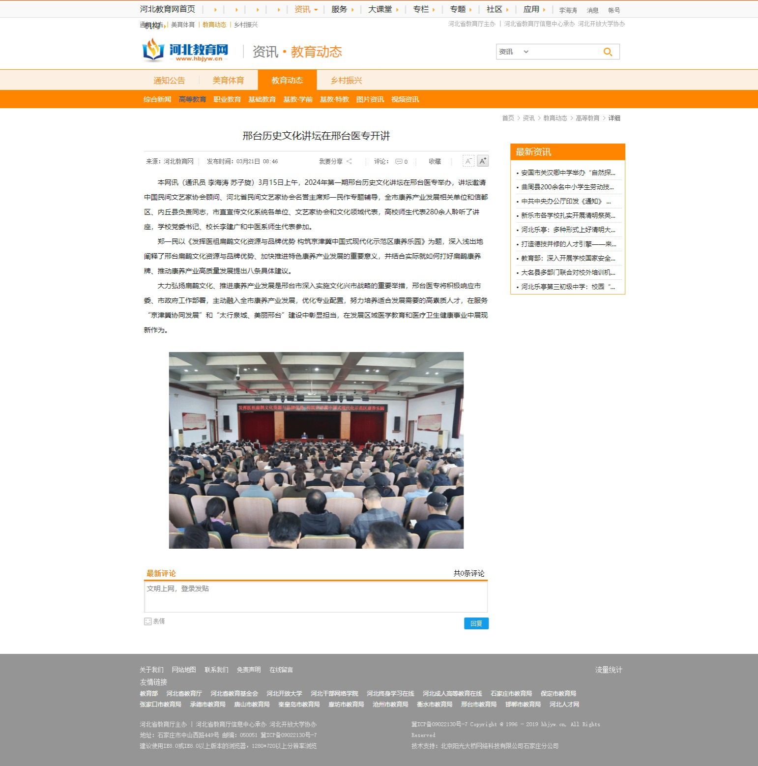 本网讯(通讯员 李海涛 苏子旋)3月15日上午,2024年第一期邢台历史文化讲坛在邢台医专举办,讲坛邀请中国民间文艺家协会顾问、河北省民间文艺家协会名誉主席郑一民作专题辅导,全市康养产业发展相关单位和信都区、内丘县负责同志,市直宣传文化系统各单位、文艺家协会和文化领域代表,高校师生代表280余人聆听了讲座,学校党委书记、校长李建广和中医系师生代表参加。