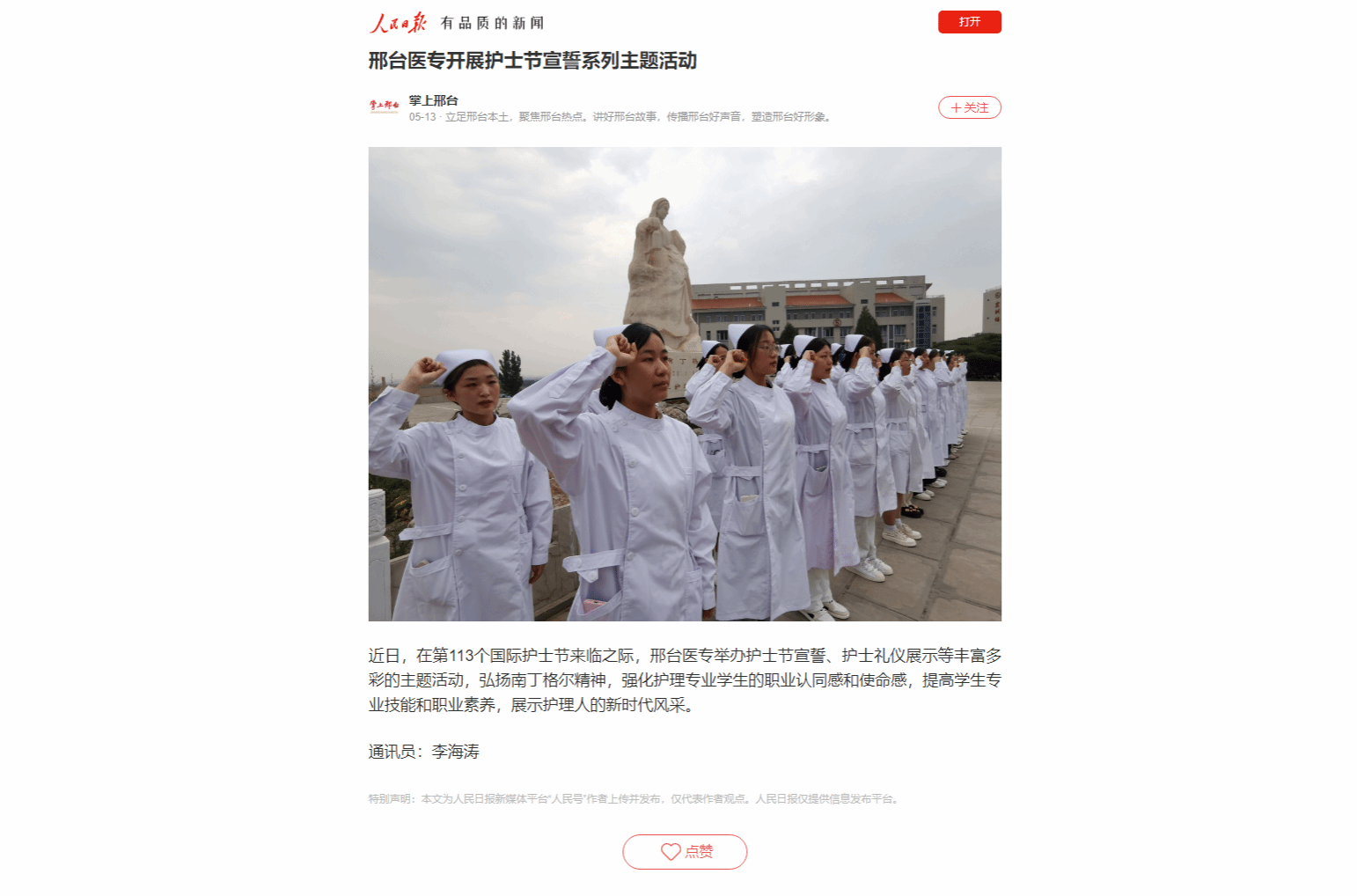 下一条:人民日报客户端:省级赛事!邢台医学高等专科学校学生获一等奖